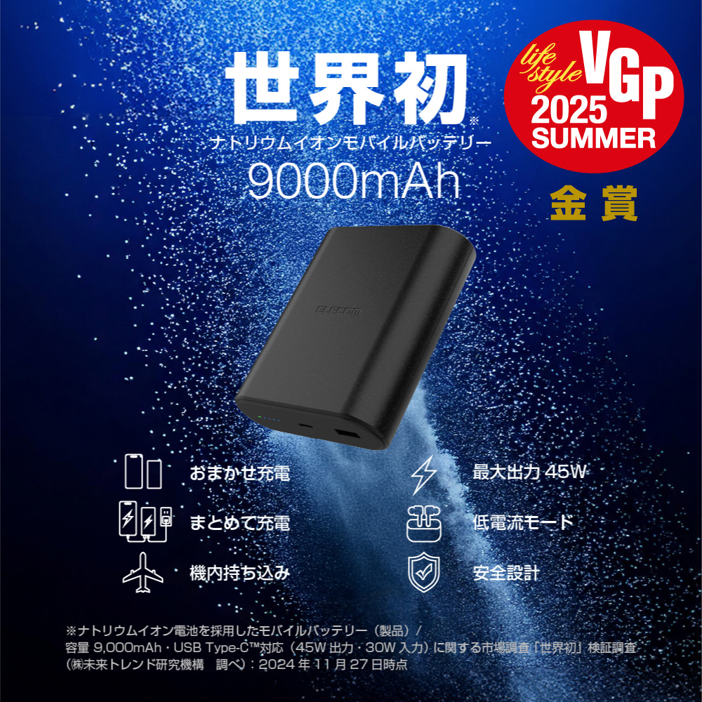 地球に優しいナトリウムイオン電池を採用した、長く使える9000mAhのモバイルバッテリーです。