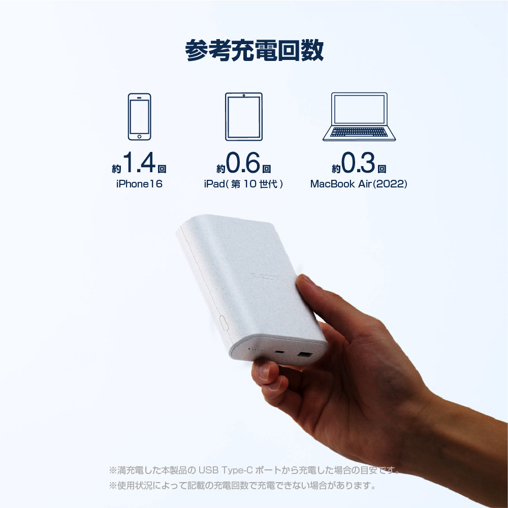 ※満充電した本製品で電源オフの状態のスマートフォンを充電する際の目安回数です。充電中に電源を入れたり、機器を使用したりしている場合は記載の数値まで充電できない場合があります。