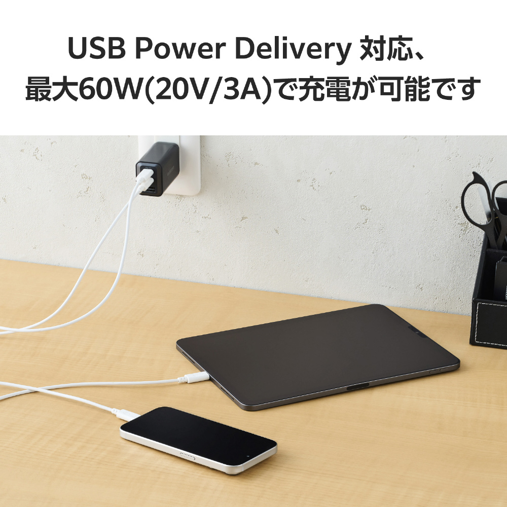 USB Power Deliveryに対応し、最大60Wで充電が可能です。スマートフォンやタブレット、一部のパソコンなどに使用できます。