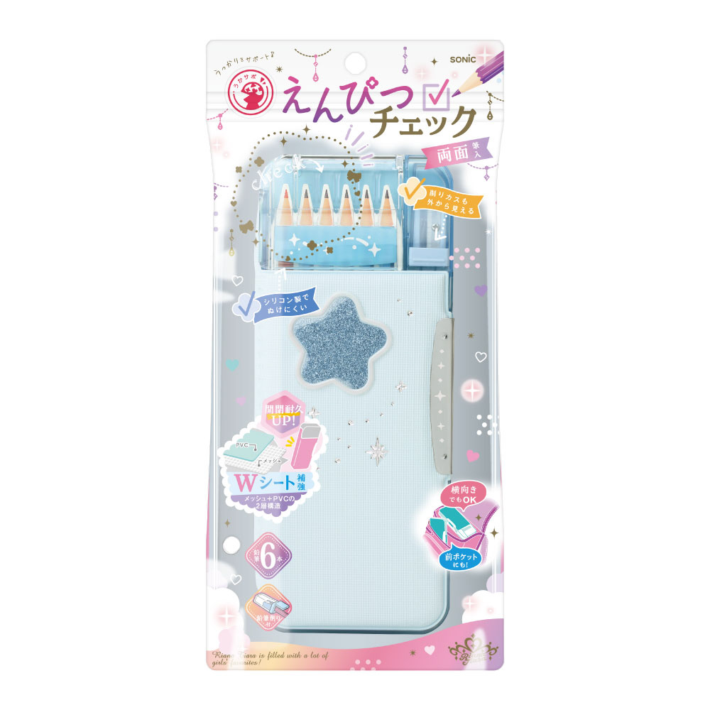 鉛筆の削り忘れ、入れ忘れ・・・そんなうっかりを解決!こどものうっかりをサポートする「えんぴつチェック両面筆入」。フタを開けずに、外側から鉛筆の芯先が見える設計だから、閉じたままでも鉛筆の有無や削り忘れのチェックができます。キラキラのラメ入りアップリケがキュート!リアナティアラシリーズ。