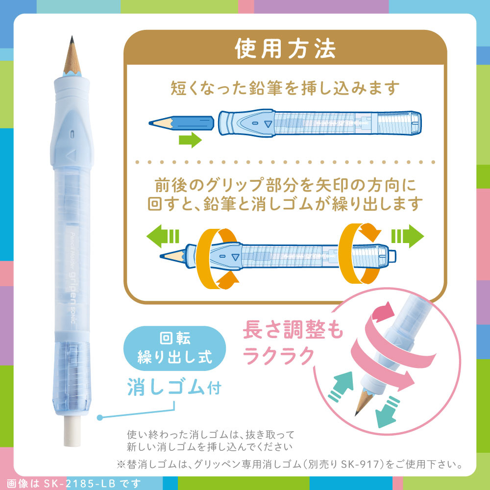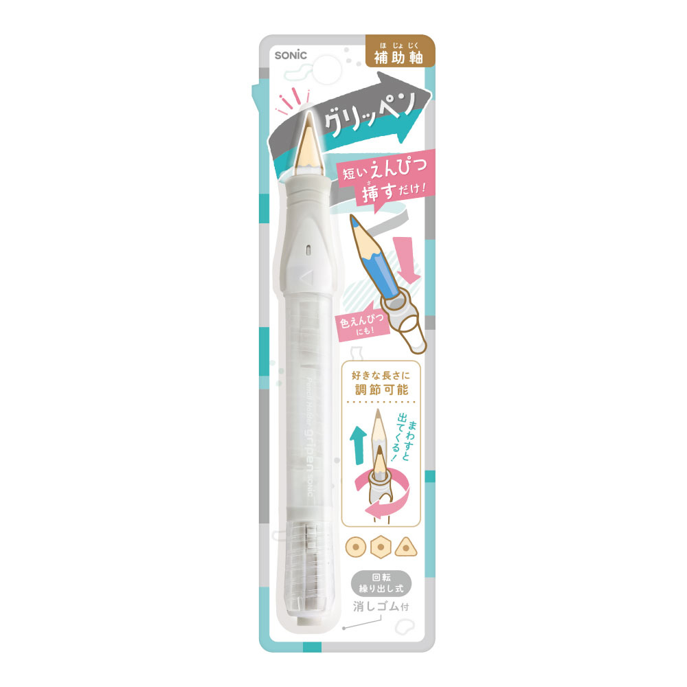 短いえんぴつ挿すだけ!超簡単な回転繰り出し式の鉛筆補助軸。疲れにくい太軸グリップ、回転繰り出し式の消しゴム付。丸・六角・三角の鉛筆に対応(JIS規格対応鉛筆)。色鉛筆にも最適。