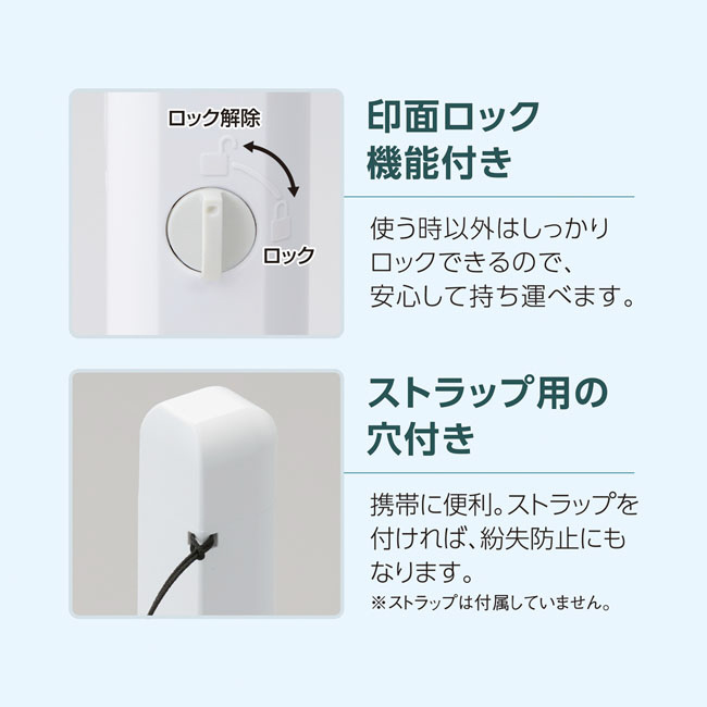 お手持ちのハンコを入れるだけで、ワンタッチでなつ印できる印鑑ホルダー「ハンコ・ベンリ」。印面ロック機能付き。使う時以外はしっかりロックできるので、安心して持ち運べます。ストラップ用の穴付き。携帯に便利。ストラップを付ければ、紛失防止にもなります。注:ストラップは付属していません。朱肉は交換可能なカートリッジ式。