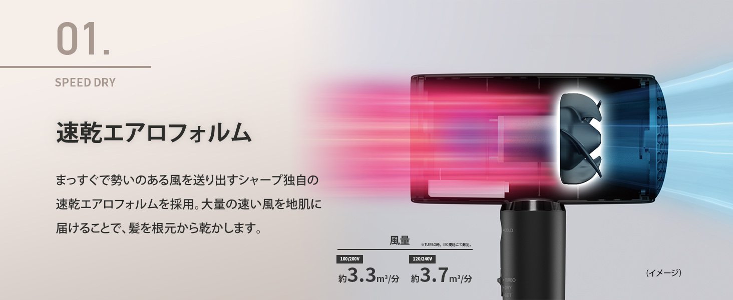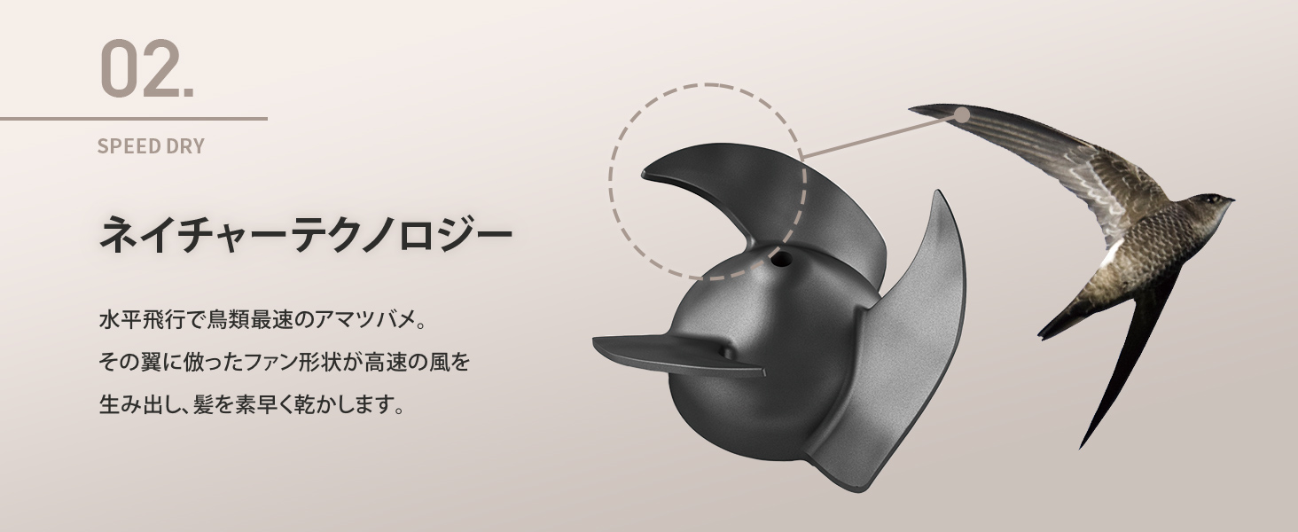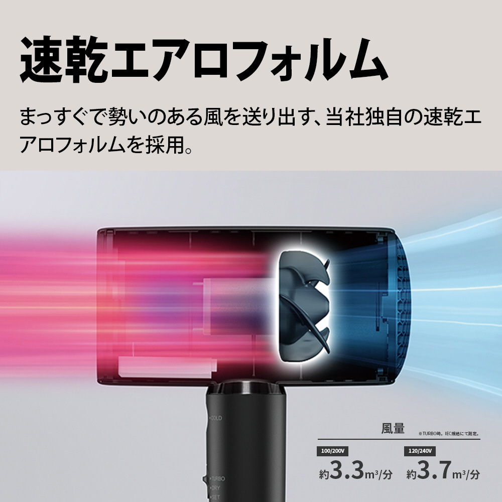 大量の速い風を髪の根元に届け、熱に頼らない速乾力を実現。
