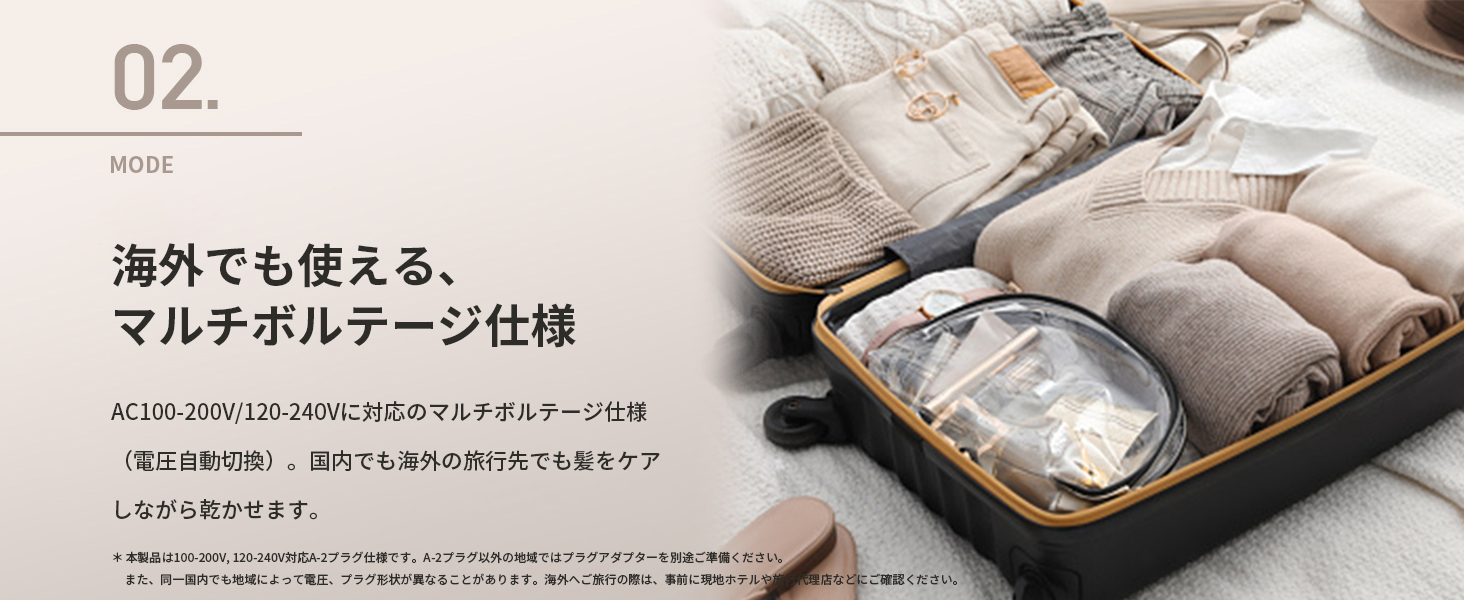 AC100-200V / AC120-240V対応で海外でも使用できます。