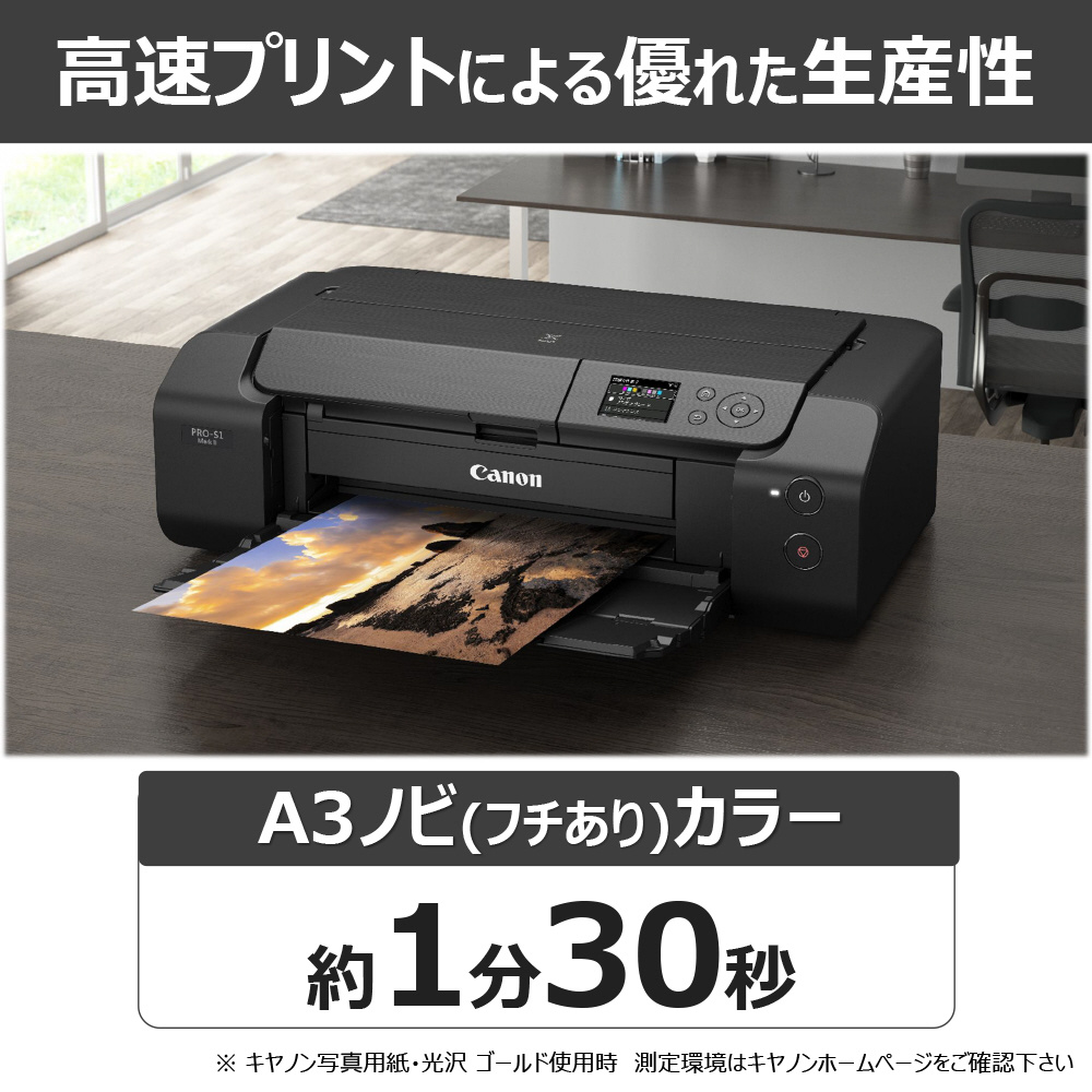 | 印刷速度 | [L判フチなし写真(1枚の印刷時間)] キヤノン写真用紙・光沢 プロ プラチナグレード:カラー 約30秒 キヤノン写真用紙・光沢 ゴールド:カラー 約30秒 [A3ノビフチあり写真(1枚の印刷時間)] キヤノン写真用紙・光沢 プロ プラチナグレード:モノクロ 約2分50秒、カラー 約1分30秒 キヤノン写真用紙・光沢 ゴールド:モノクロ 約2分50秒、カラー 約1分30秒 |
