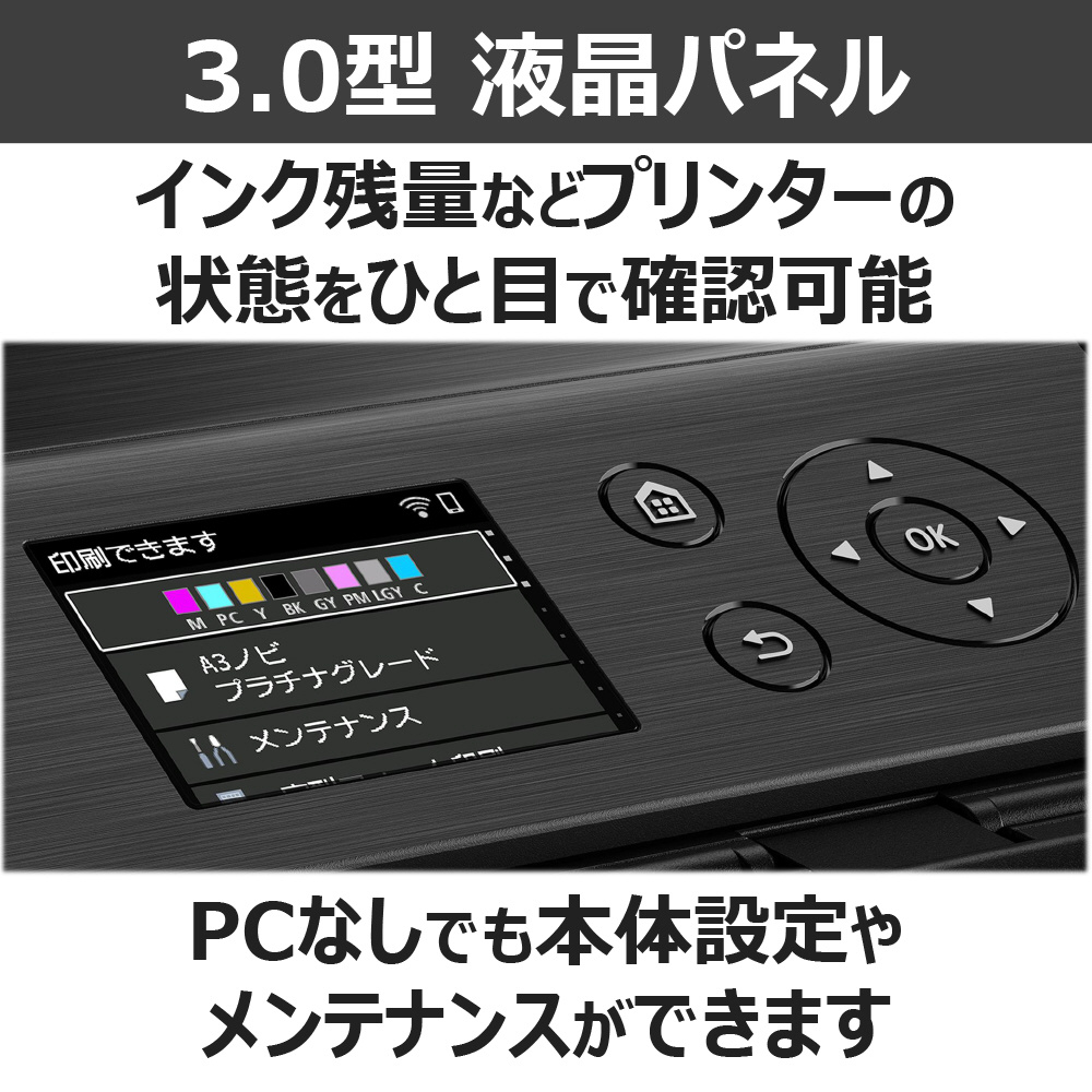 | 仕様2 | [最高解像度(dpi)]4800(横)×2400(縦) [プリントヘッド] 総ノズル数:計6144ノズル 各色ノズル数:C/M/Y/BK/PC/GY/PM/LGY 各768x8 ノズル [プリント必要マージン(カット紙)] フチなしプリント時:上下左右:0mm フチありプリント時:上端 3mm、下端 5mm、左右 各3.4mm(レター・リーガルは左 6.4mm、右 6.3mm)ファインアート紙の推奨は上/下端 各25mm |