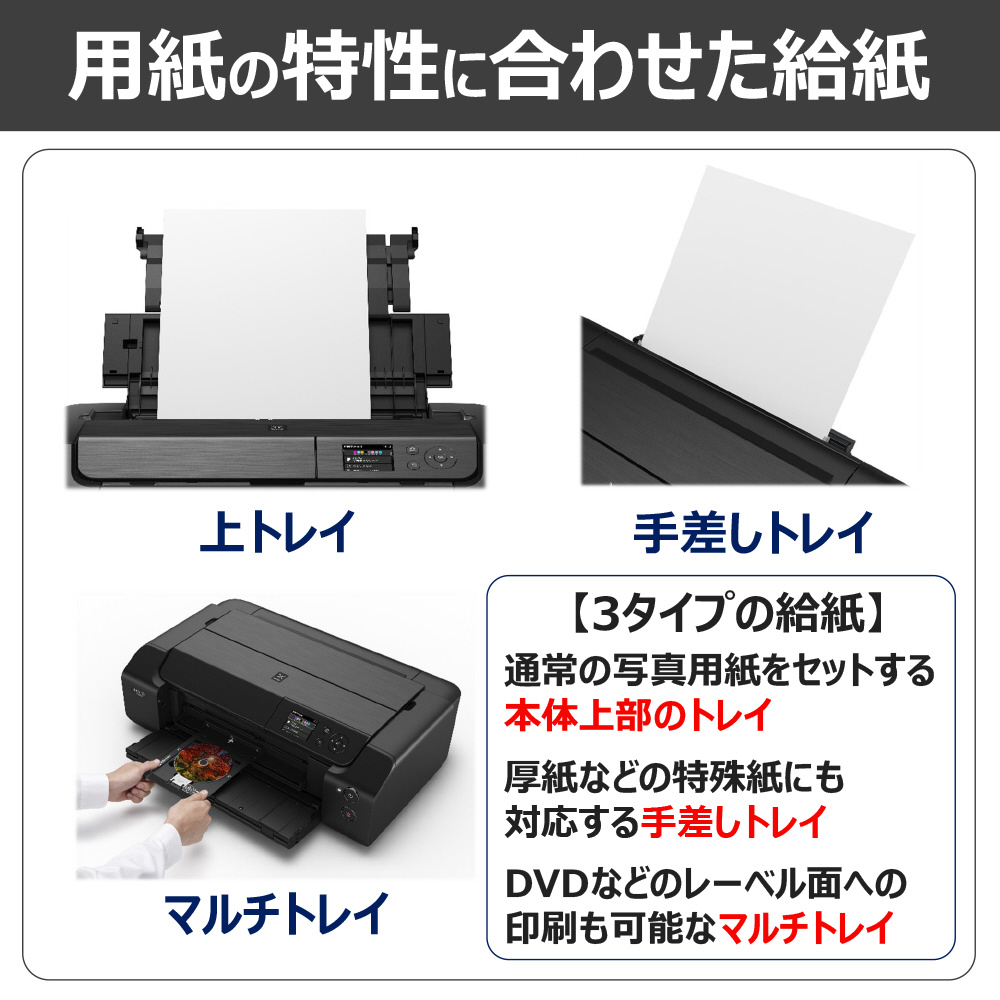 通常の写真用紙をセットする本体上部のトレイに加え、厚紙などの特殊紙にも対応する手差しトレイを設置しています。
