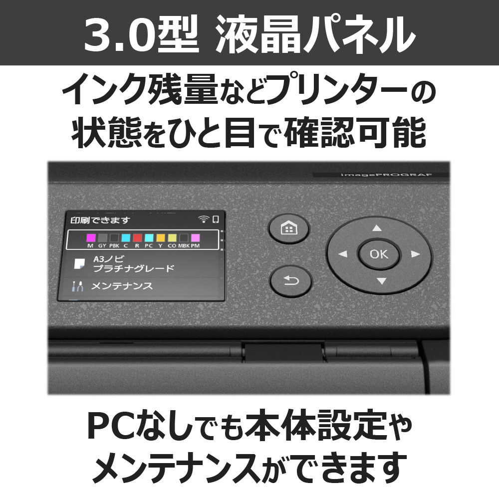 | 仕様2 | [最高解像度(dpi)]4800(横)×2400(縦) [プリントヘッド] 総ノズル数:計7680ノズル 各色ノズル数:MBK/PBK/C/M/Y/GY/PC/PM/R/CO×各768ノズル [プリント必要マージン(カット紙)] フチなしプリント時:上下左右:0mm フチありプリント時:上端 3mm、下端 5mm、左右:各3.4mm(レター・リーガルは左 6.4mm、右 6.3mm)ファインアート紙は上/下端 各25mm |