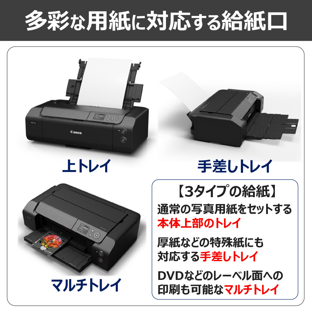 メディア特性に合った3タイプの給紙口により、多彩なメディアに対応。通常の写真用紙をセットする本体上部のトレイに加え、厚紙などの特殊紙にも対応する手差しトレイを設置。