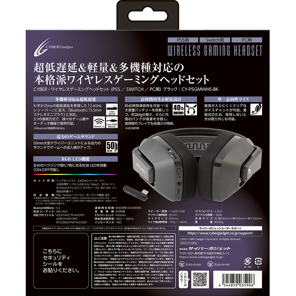 PS5/SWITCH用ワイヤレスゲーミングヘッドセット ブラック [CY-P5GMWHS-BK]