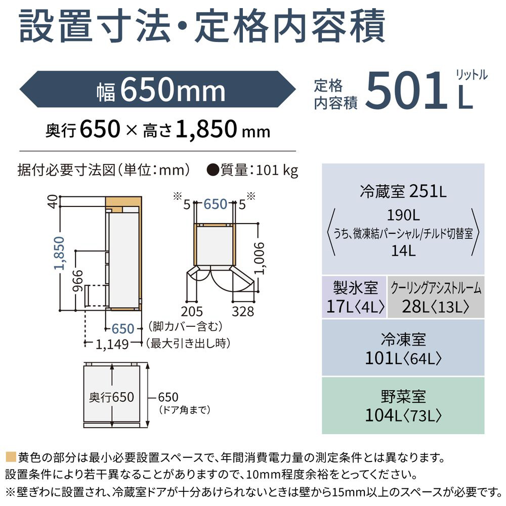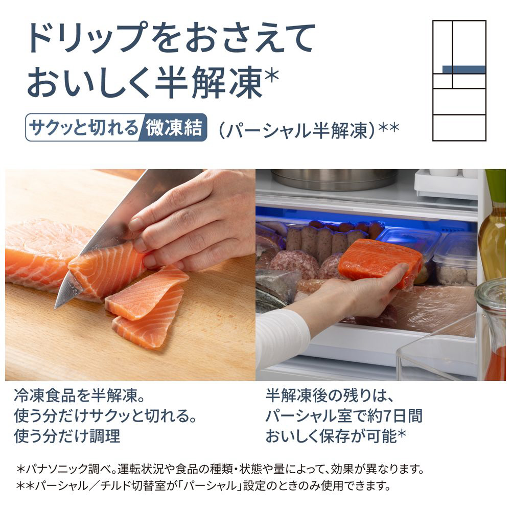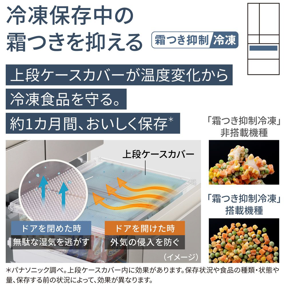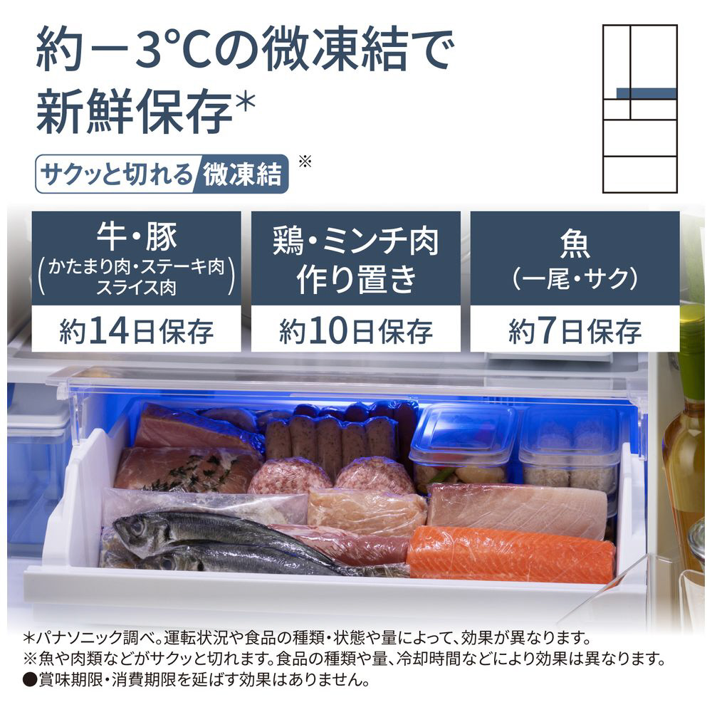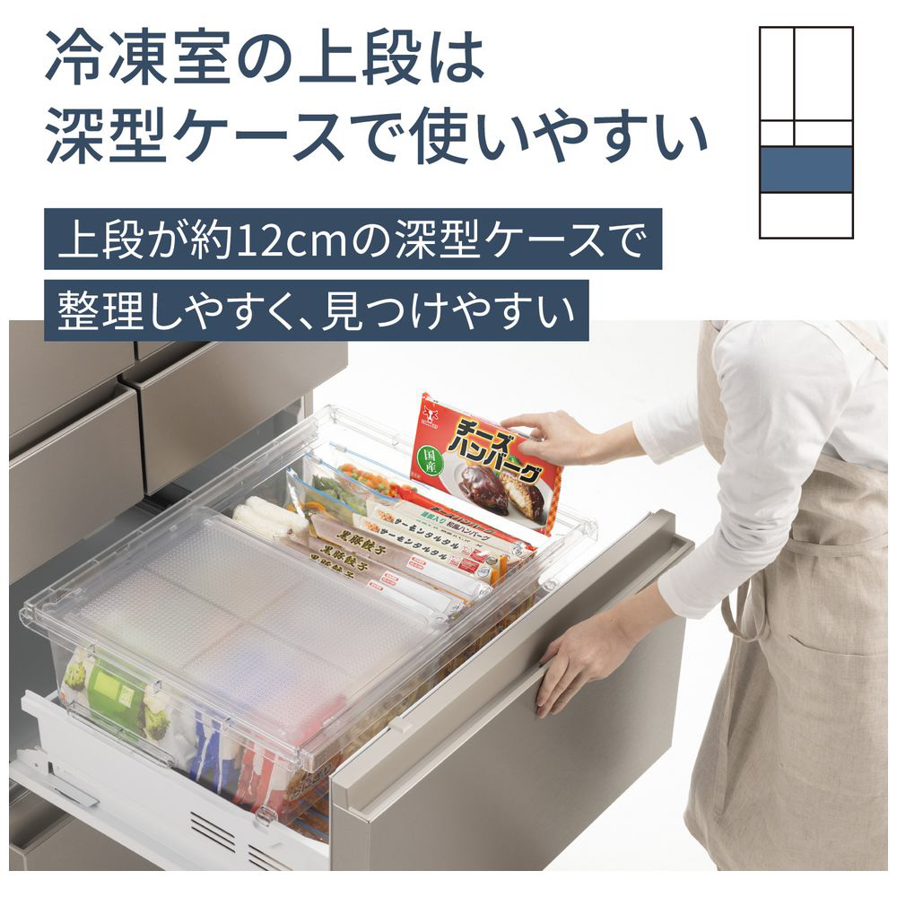 「コンパクトBIG」モデル。設置スペースはコンパクトに。冷凍室は大容量に。「霜つき抑制冷凍」搭載のハイグレードモデル。