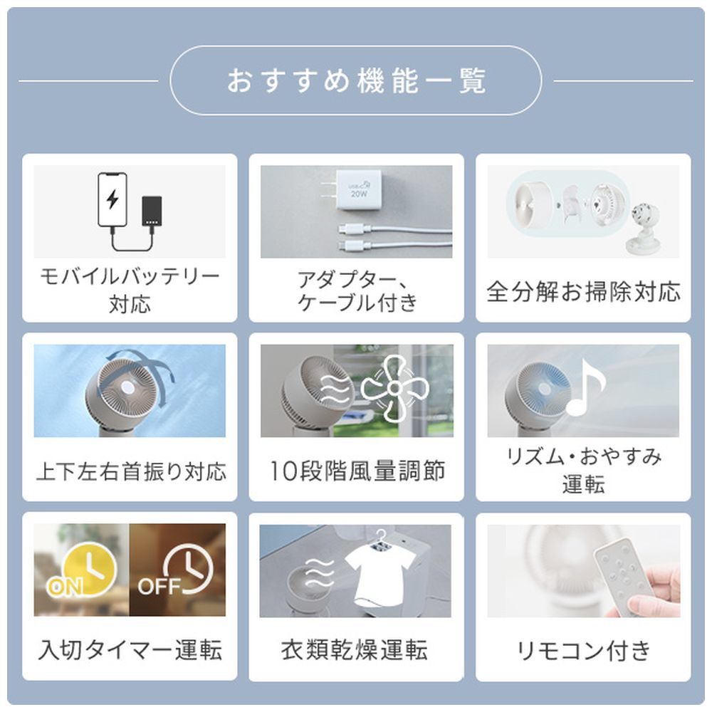 PD仕様。充電式で持ち運び可能!DCモーター搭載で省エネ・静音設計!上下角度125°(手動含む)で真下から狙い撃ち乾燥!工具不要でラクラクお手入れ可能。モバイルバッテリーからも給電可能、いつでも、もしも(災害)の時に活躍 。