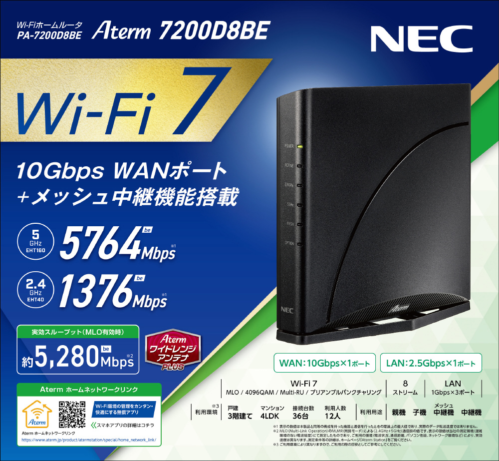 | 商品名 | Wi-Fiルーター 5764+1376Mbps Aterm 7200D8BE PA-7200D8BE [Wi-Fi 7(be) /IPv6対応] |