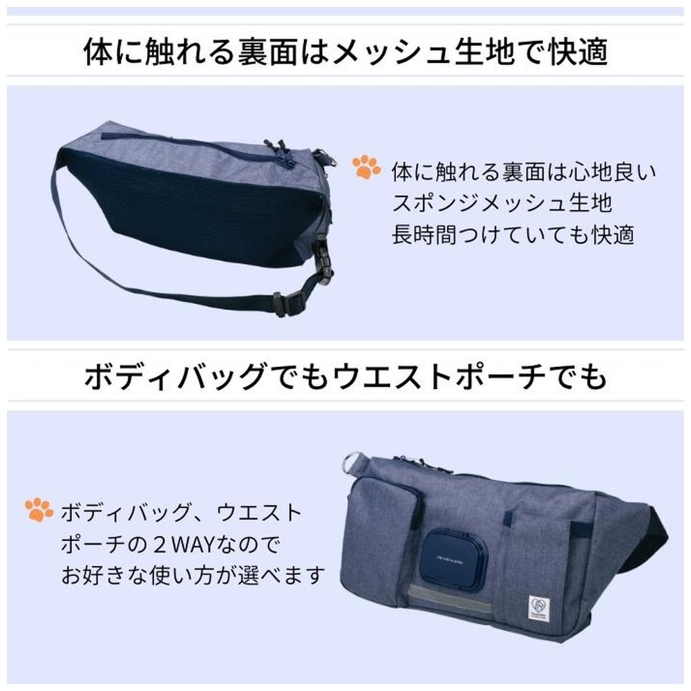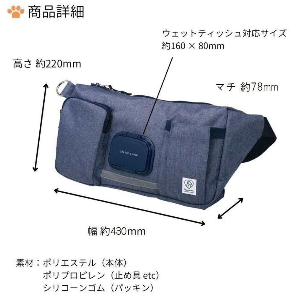 ウェットシートポケット付きボディバッグ。長さ調節可能なベルトで、ワンショルダーバッグやボディバッグ、ウエストバッグにも使えます。