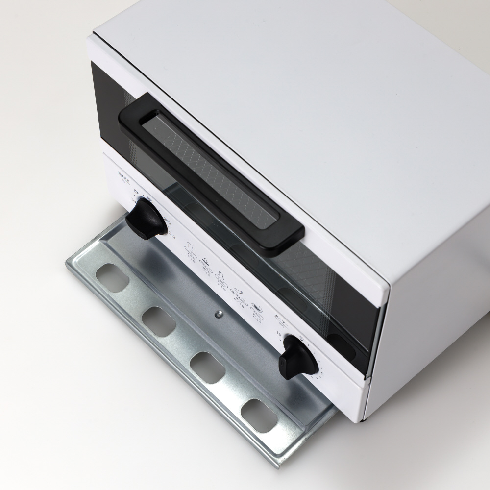 ドアを開けると焼き網が手前にスライドし、簡単に食材を出し入れできます。庫内に落ちたパンくずはパンくずトレイを引き出せば簡単にお手入れできます。