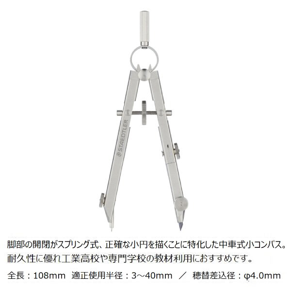 差込径が4.0mmのスプリング小コンパスは、コンパクトでスタイリッシュなデザインのコンパスです。