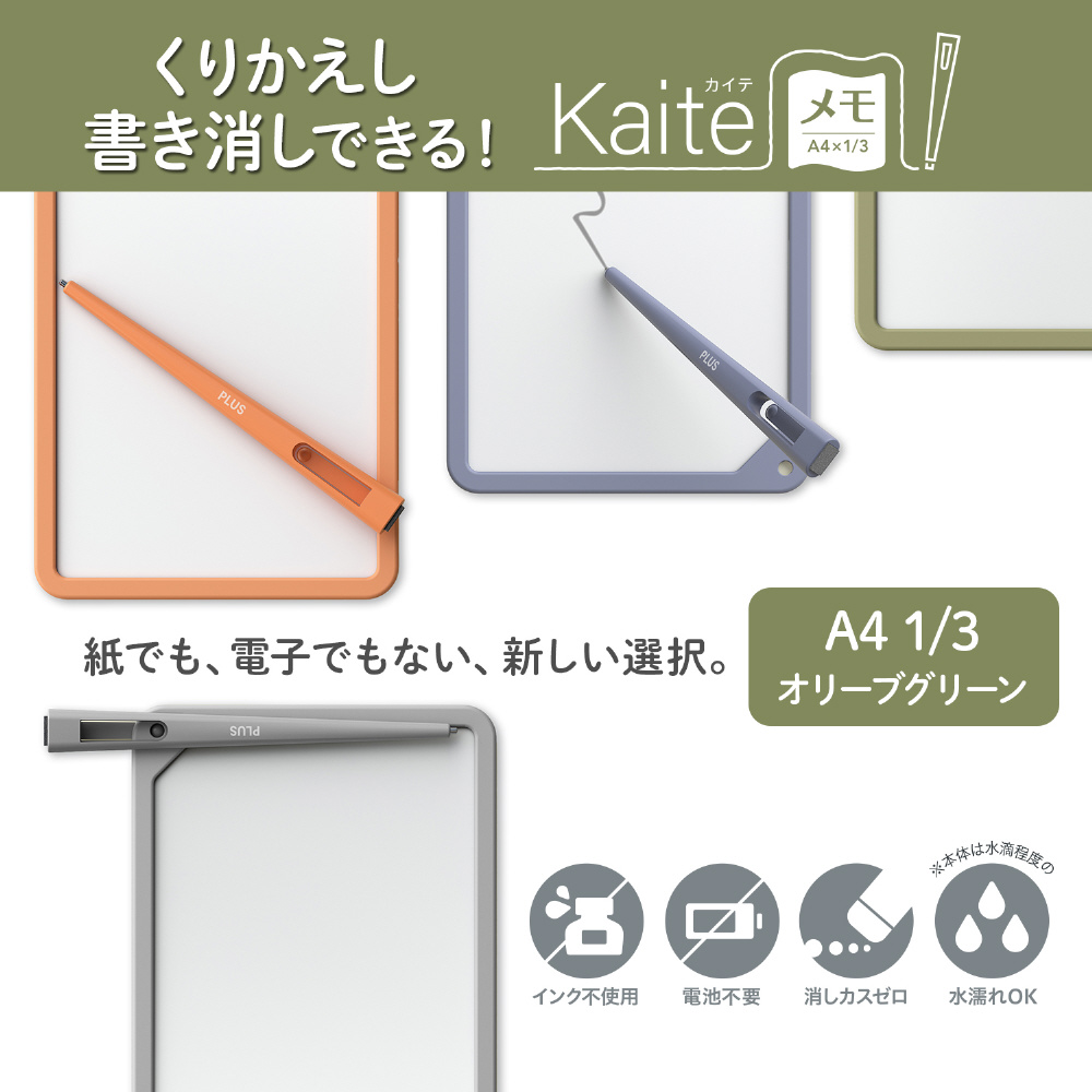 紙でも、電子でもない、新しい選択。必要なのはKaiteだけ。何度もくり返し、紙のようにスラスラ書き消しできるメモ、Kaite(カイテ)。