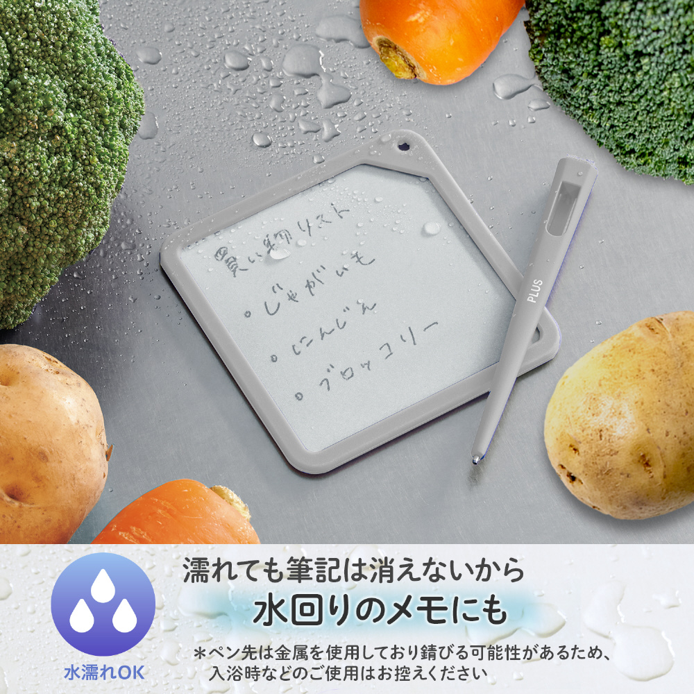 鉛筆で紙に書くように滑らかに筆記でき、ペン後部のイレーザーで一文字でも自在な消去が可能です。メモ用紙の代わりに活用でき、そのユニークな機能性で好評を得ています。書いた文字のコントラストが従来品より向上し、より鮮明に。立ったままでもメモができる強度と、滑らかな書き心地を実現しました。さらに消字性能も向上し、仕事や生活におけるさまざまな“メモをしたい”というニーズに応えます。水にぬれても文字がにじんだり消えたりしないため、オフィスだけでなくご家庭のキッチンなどでも幅広く活用いただけます。