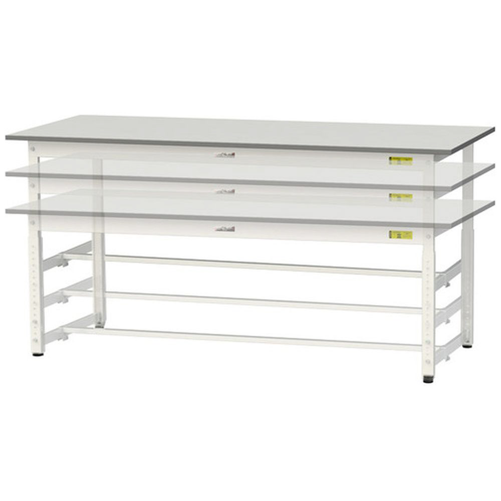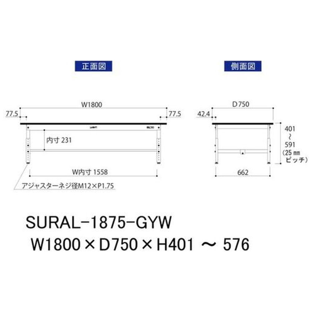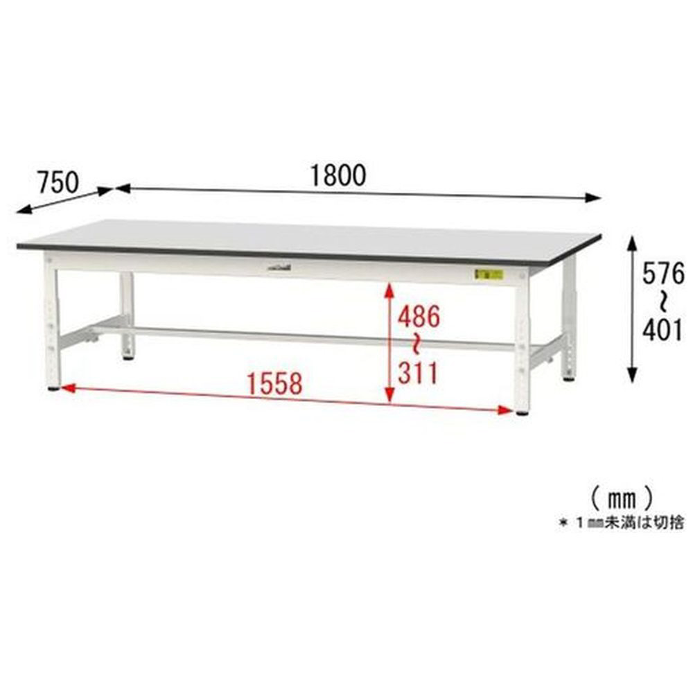 | 商品名 | ワークテーブル150シリーズ 高さ調整タイプ低床用 RoHS2指令対応塩ビシート天板 W1800×D750×H401〜H576mm |