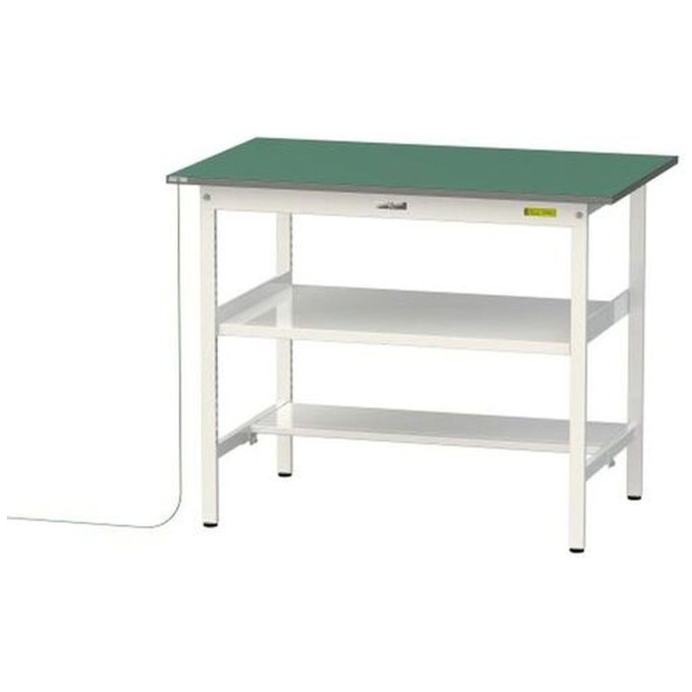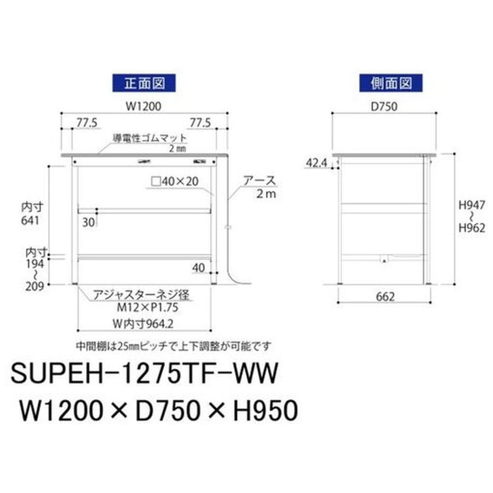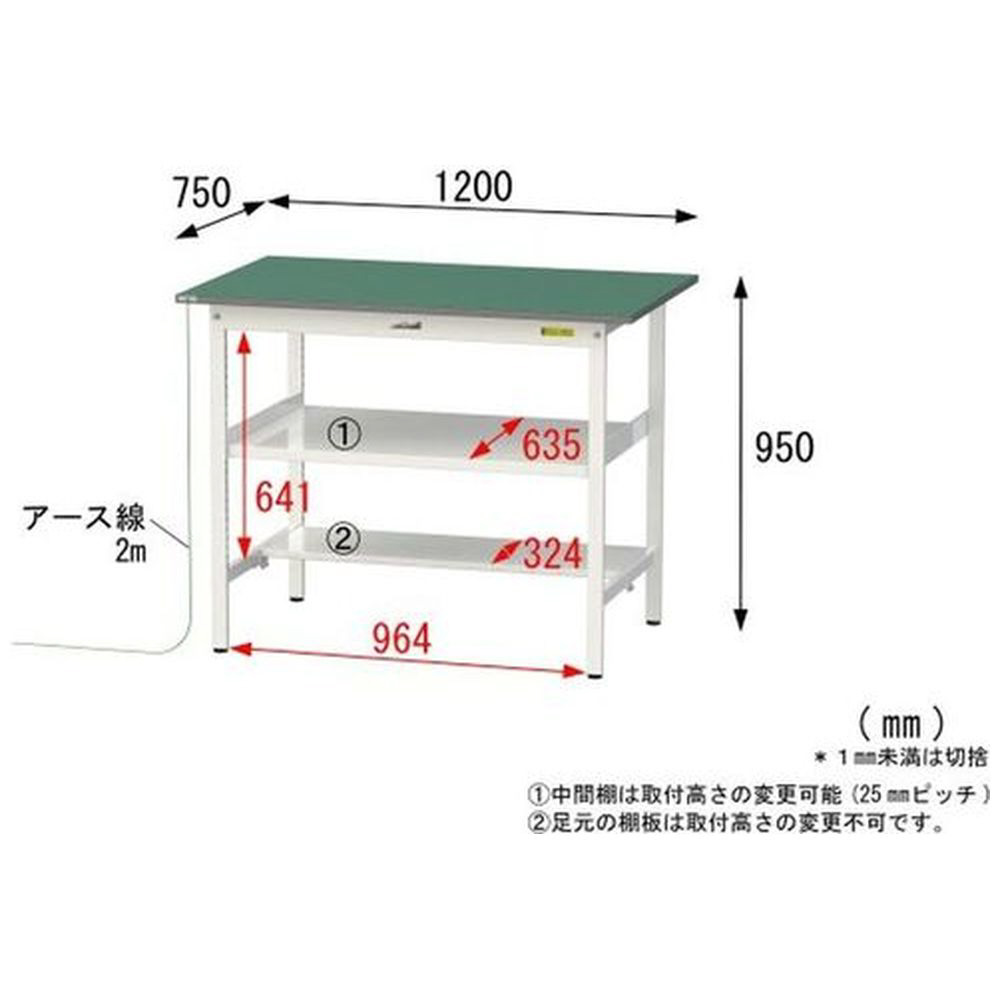 ワークテーブル150シリーズ 導電性ゴムマット貼りタイプ 固定式 中間棚・半面棚板付 W1200×D750×H950mm 緑マット/シルキーホワイト