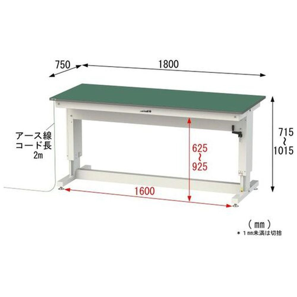 ワークテーブル昇降タイプ 導電性ゴムマット貼りタイプ W1800×D750×H715〜H1015mm 緑マット/シルキーホワイト