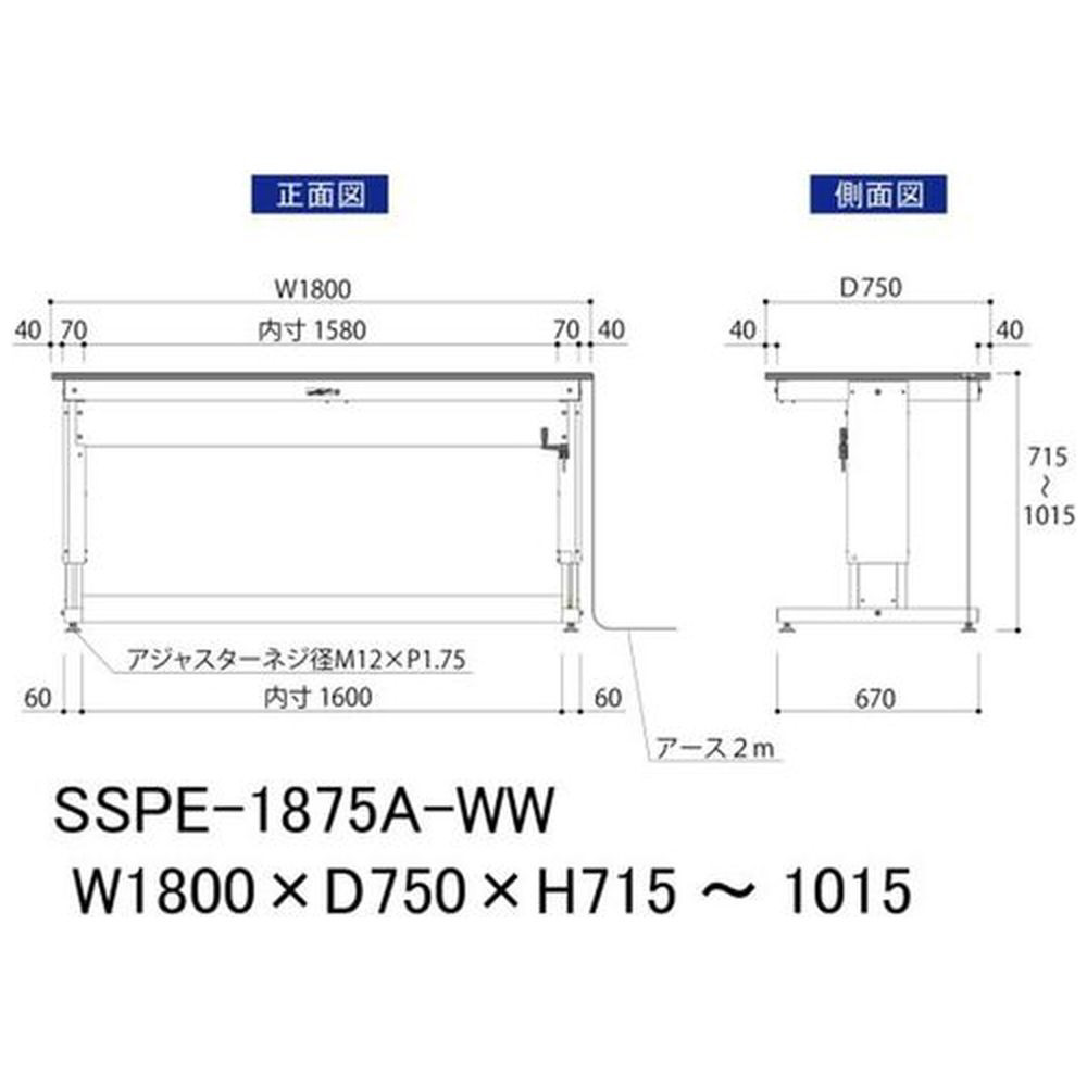 | 商品名 | ワークテーブル昇降タイプ 導電性ゴムマット貼りタイプ W1800×D750×H715〜H1015mm 緑マット/シルキーホワイト |