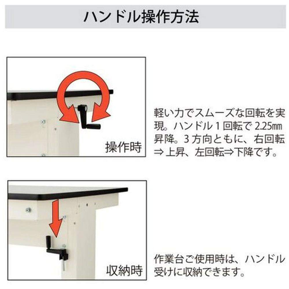 RoHS2対応塩ビシート天板仕様のハンドル昇降式の作業台です。