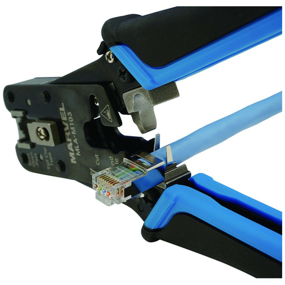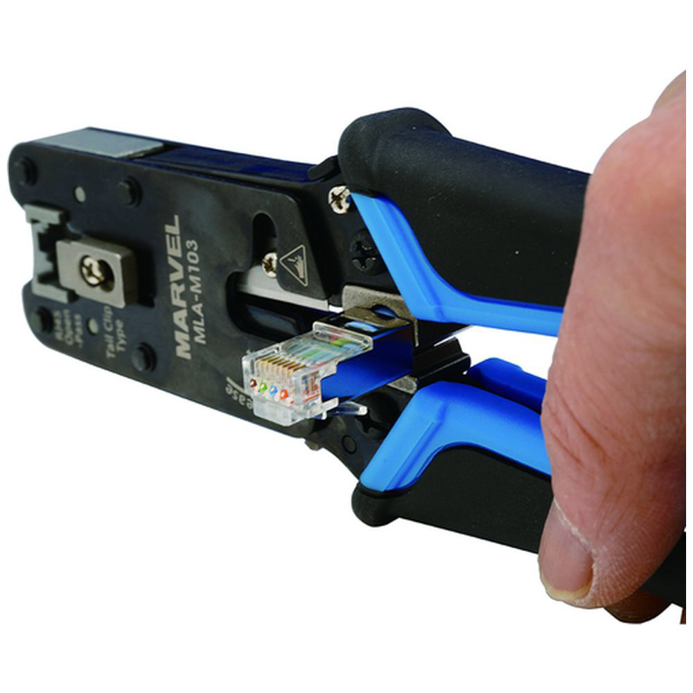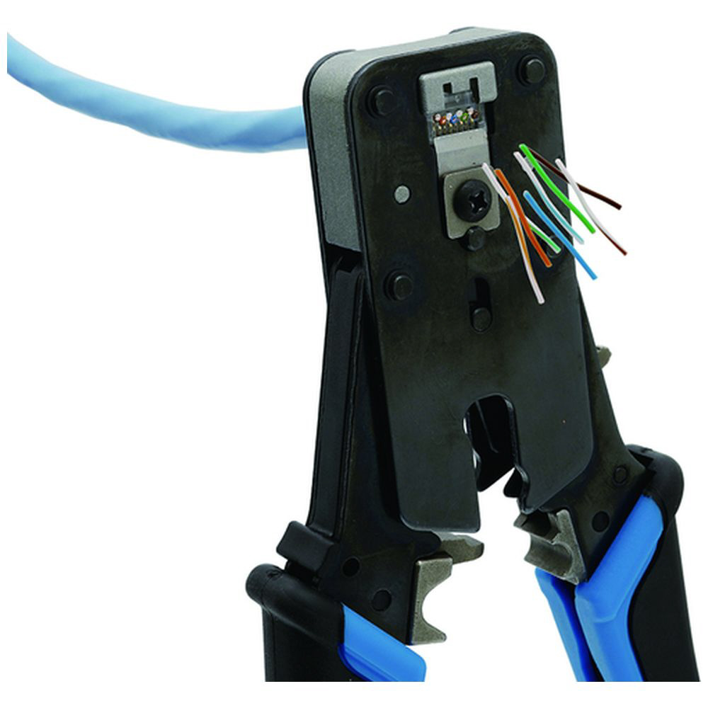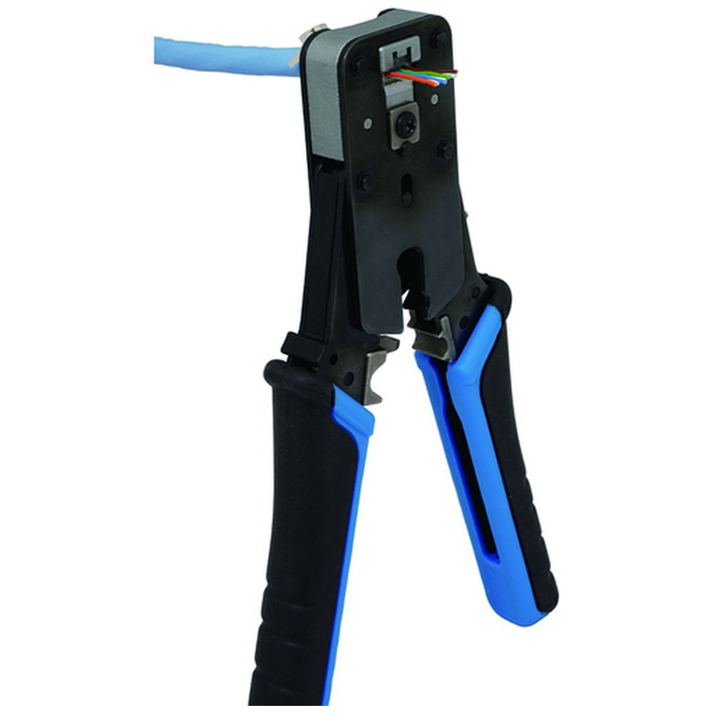 貫通式モジュラープラグ専用の圧着機で、確実な結線が可能です。
