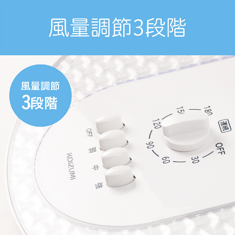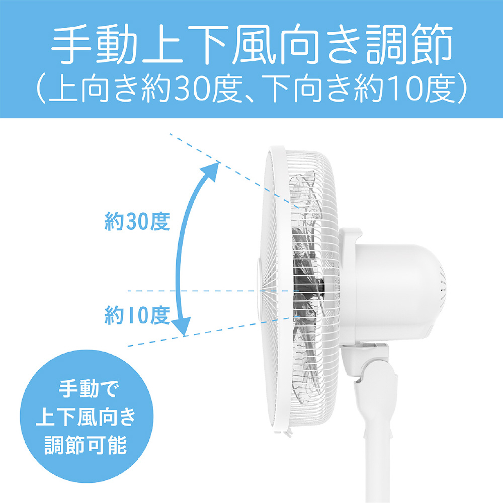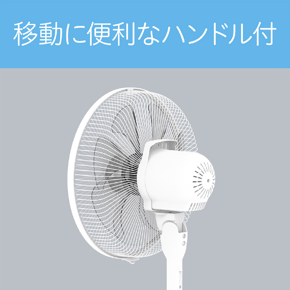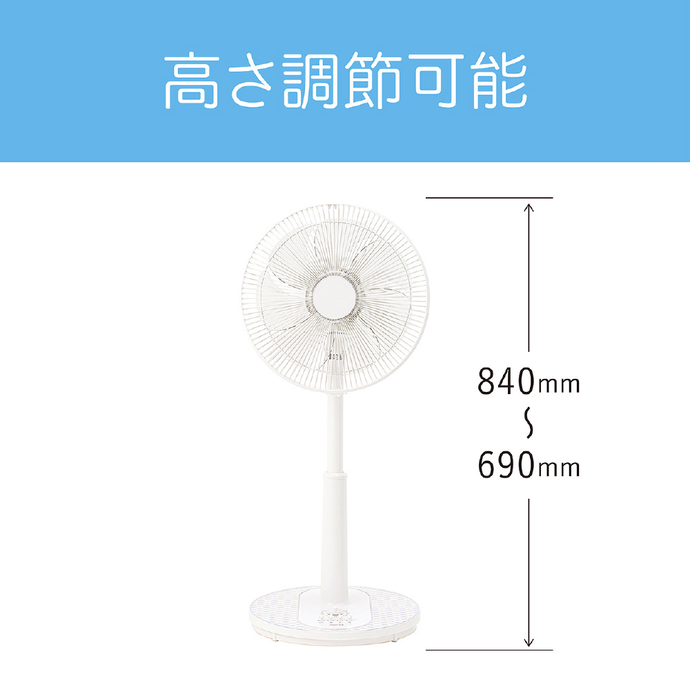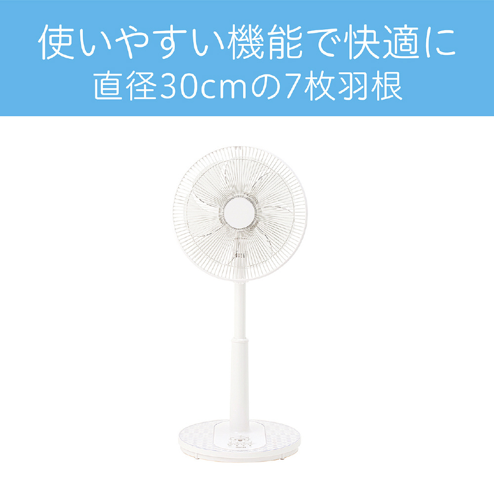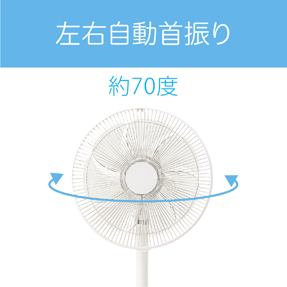 涼しげな輝きのある台座デザインで高級感のある扇風機。直感的に操作できる物理的なツマミ&ボタンを採用。風量調節3段階、左右首振り機能(約70度)、切タイマー(最大約180分)。