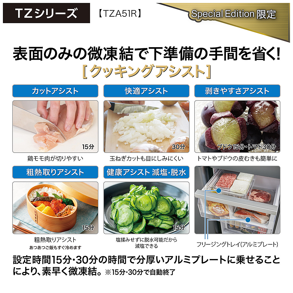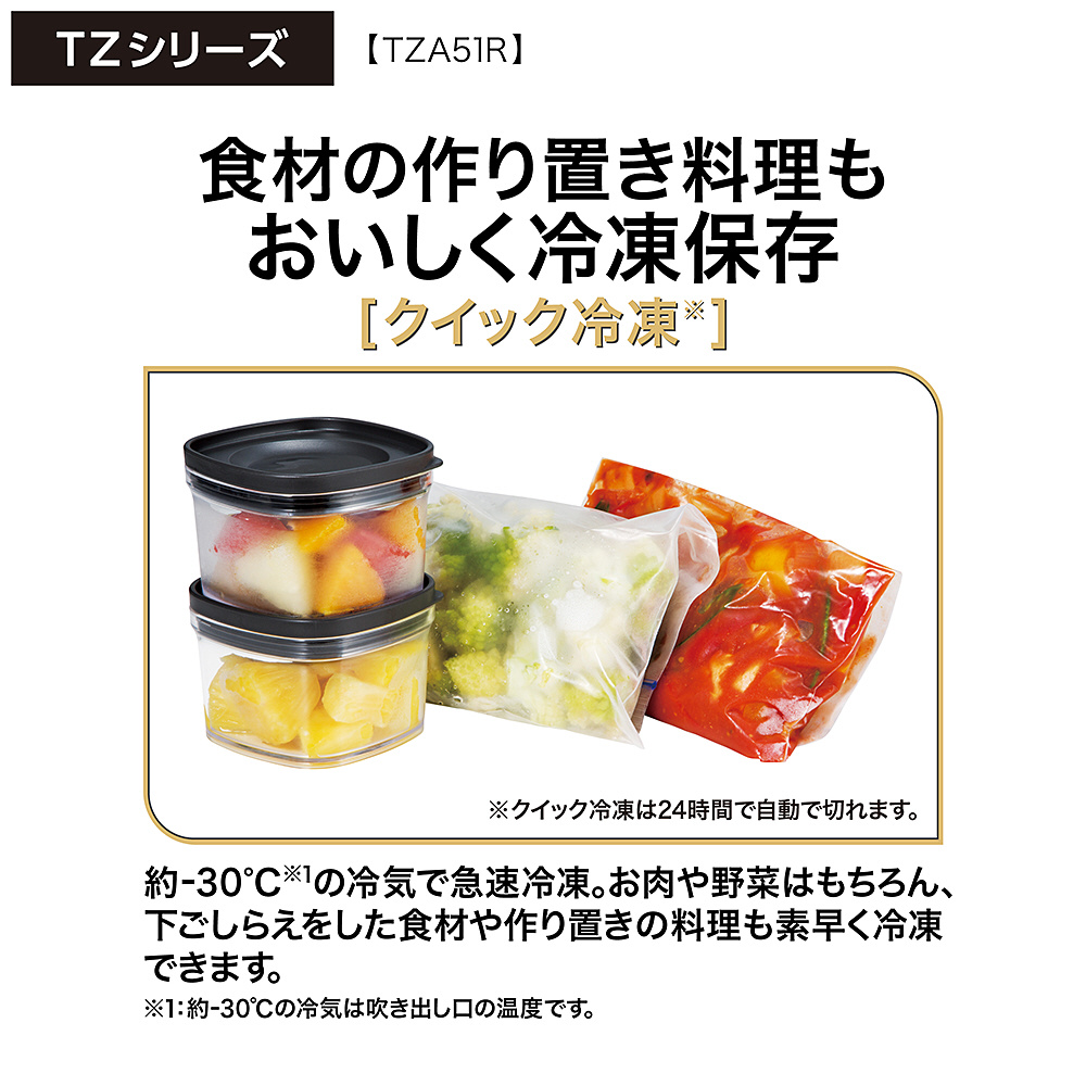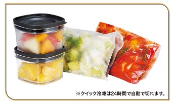 約-30℃の冷気で急速冷凍。お肉や野菜はもちろん、下ごしらえをした食材や作り置きの料理も素早く冷凍できます。