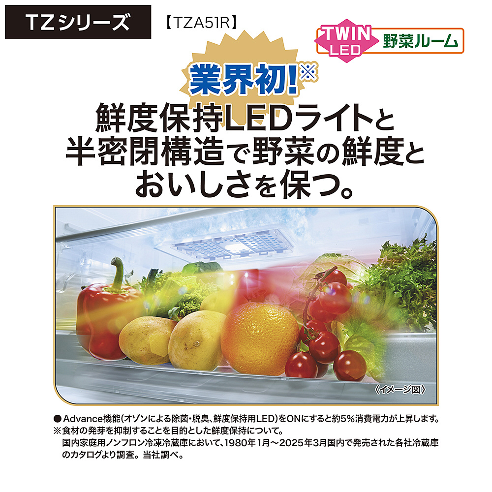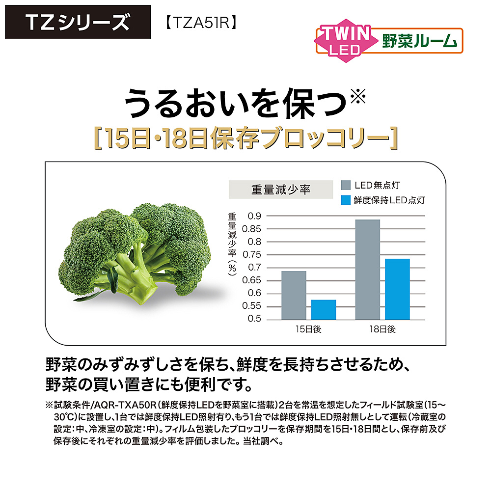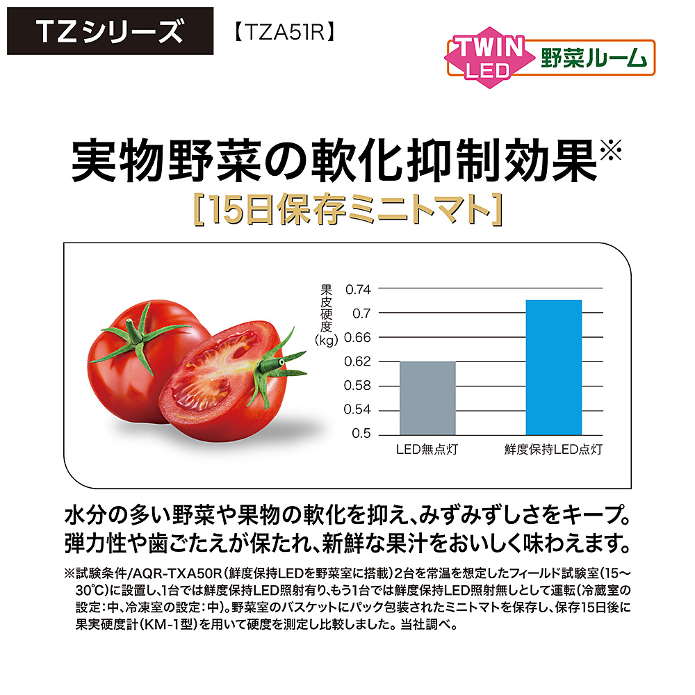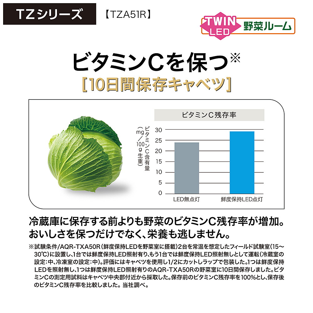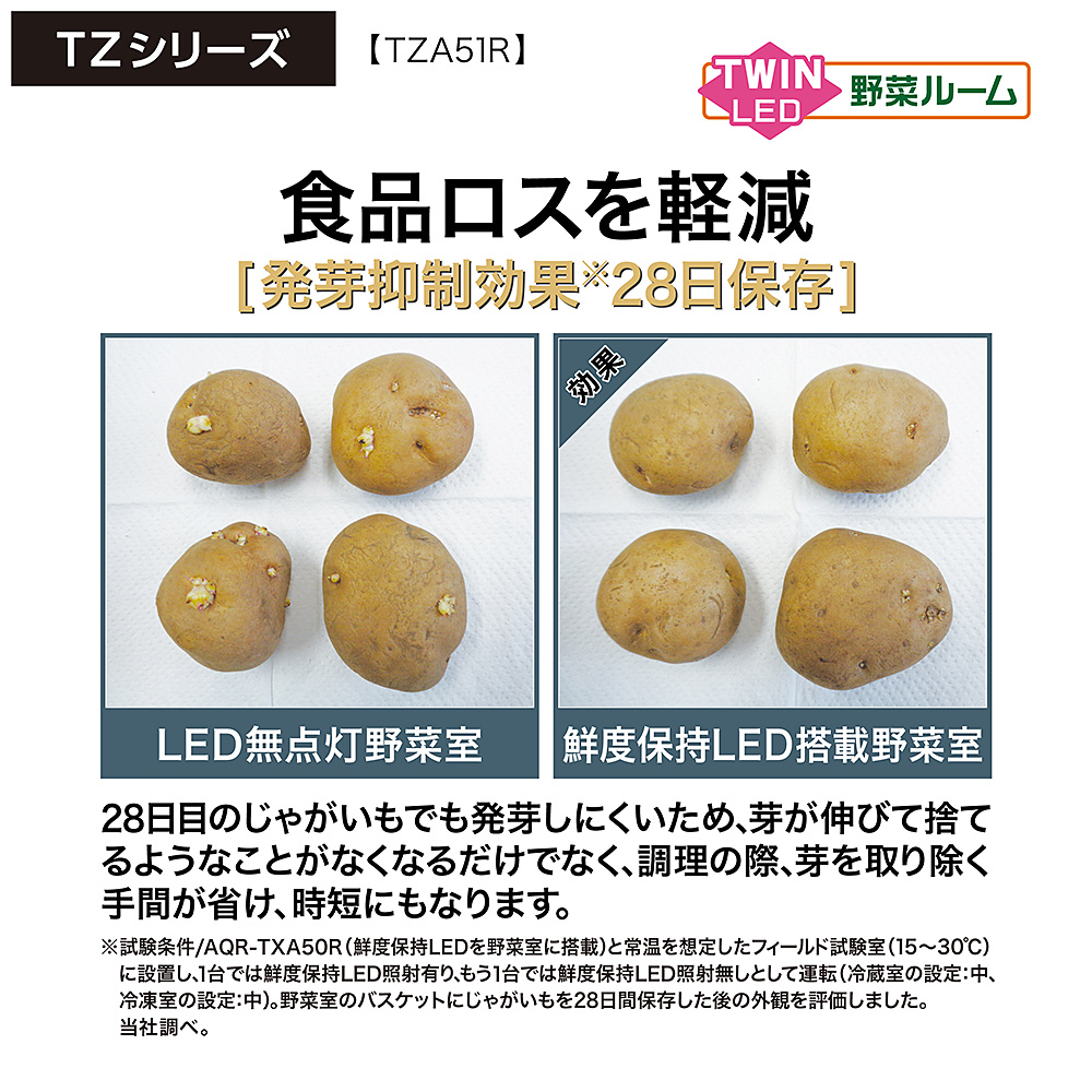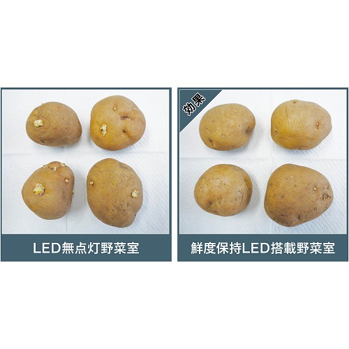 ※試験条件/AQR-TXA50R(鮮度保持LEDを野菜室に搭載)と常温を想定したフィールド試験室(15〜30℃)に設置し、1台では鮮度保持LED照射有り、もう1台では鮮度保持LED照射無しとして運転(冷蔵室の設定:中、冷凍室の設定:中)、野菜室のバスケットにじゃがいもを28日間保存した後の外観を評価しました。