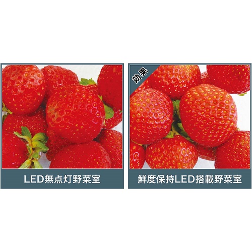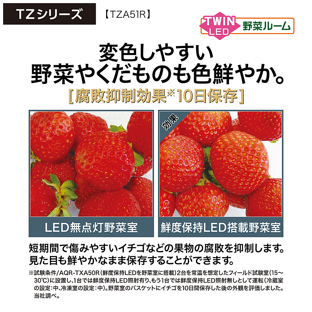 ※試験条件/AQR-TXA50R(鮮度保持LEDを野菜室に搭載)2台を常温を想定したフィールド試験室(15〜30℃)に設置し、1台では鮮度保持LED照射有り、もう1台では鮮度保持LED照射無しとして運転(冷蔵室の設定:中、冷凍室の設定:中)、野菜室のバスケットにイチゴを10日間保存した後の外観を評価しました。