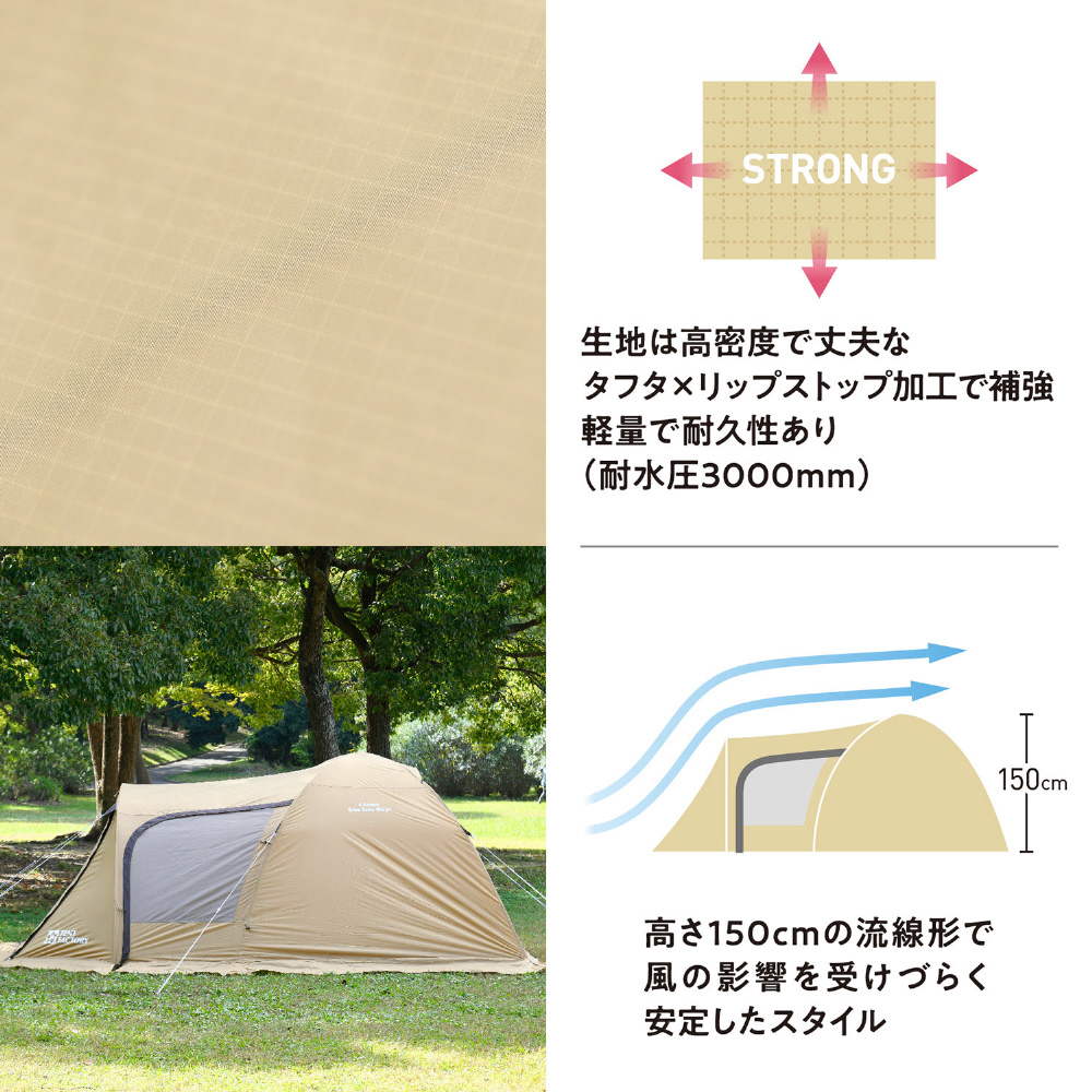 | 材質 | ポール:FG(ファイバーグラス) アウターテント:ポリエステルタフタ+リップストップ210T 68D(耐水圧3000mm) インナーテント:ポリエステルタフタ185T 75D(耐水圧800mm)・フロアパーツ:ポリエステルオックスフォード(耐水圧3000mm) |