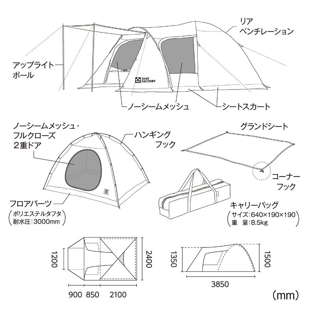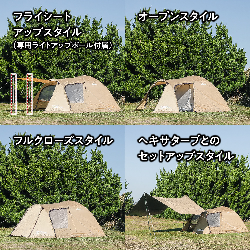| 付属品 | 専用グランドシート(PE)、アップライトポール、ペグ:24本、ガイドロープ:2.5m×8 |