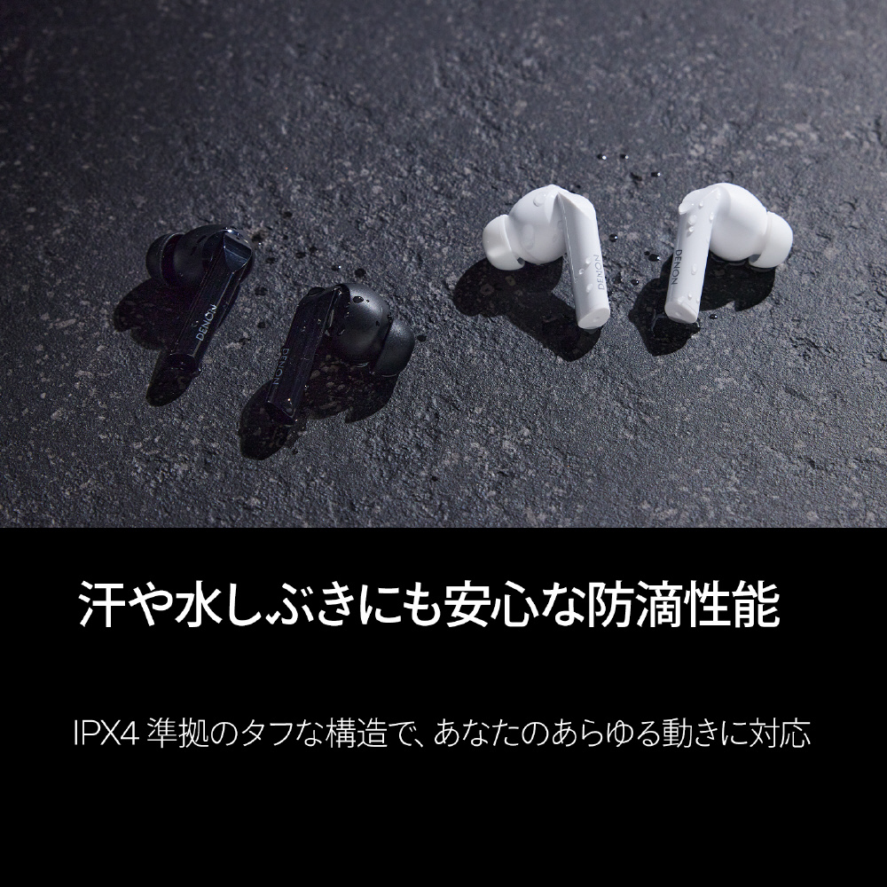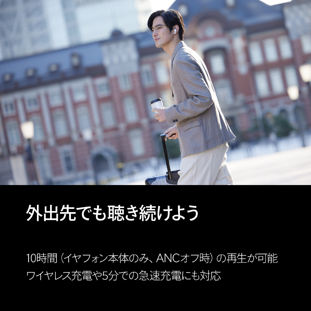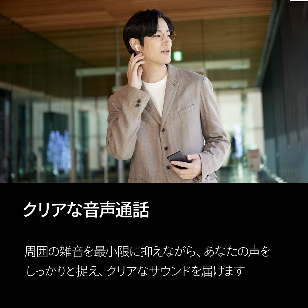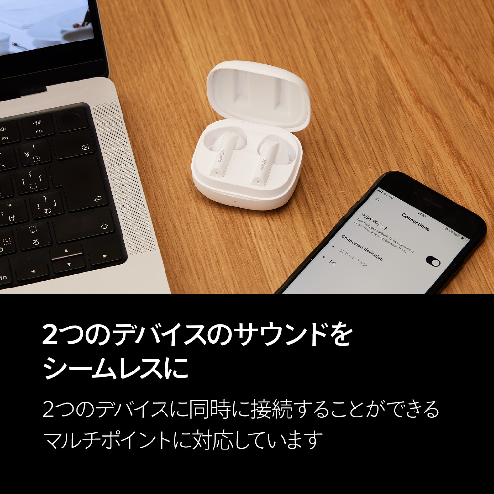 一日中着けたままでも快適な装着感と洗練されたデザイン、マルチポイント接続、安心の防滴性能、最大35 時間の再生時間を実現しています。