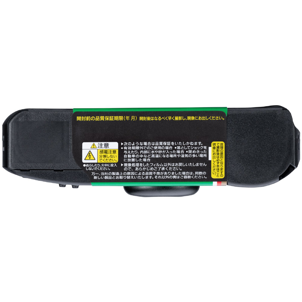 | 仕様3 | ■電池:単4形 1.5Vアルカリマンガン乾電池内蔵 ■寸法:H54×W108×D34mm ■重量(27枚撮り):約90g |