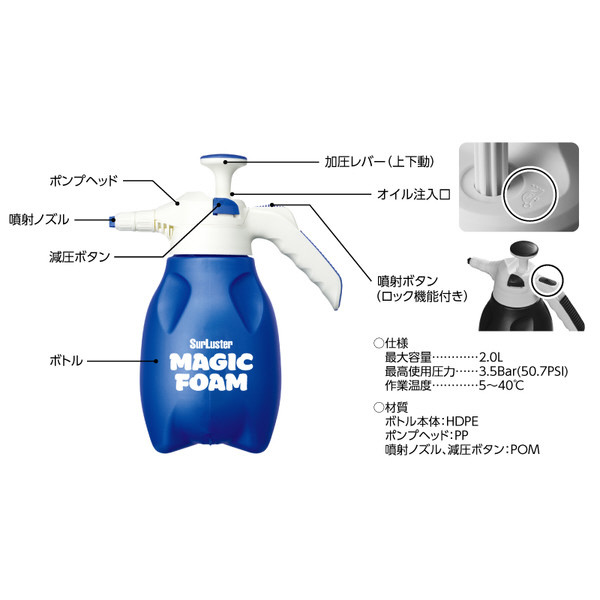 マジックフォーム フォームガン(蓄圧タイプ/粉雪の様なきめ細かい泡)電源不要・手動タイプ 容量:2L S-161
