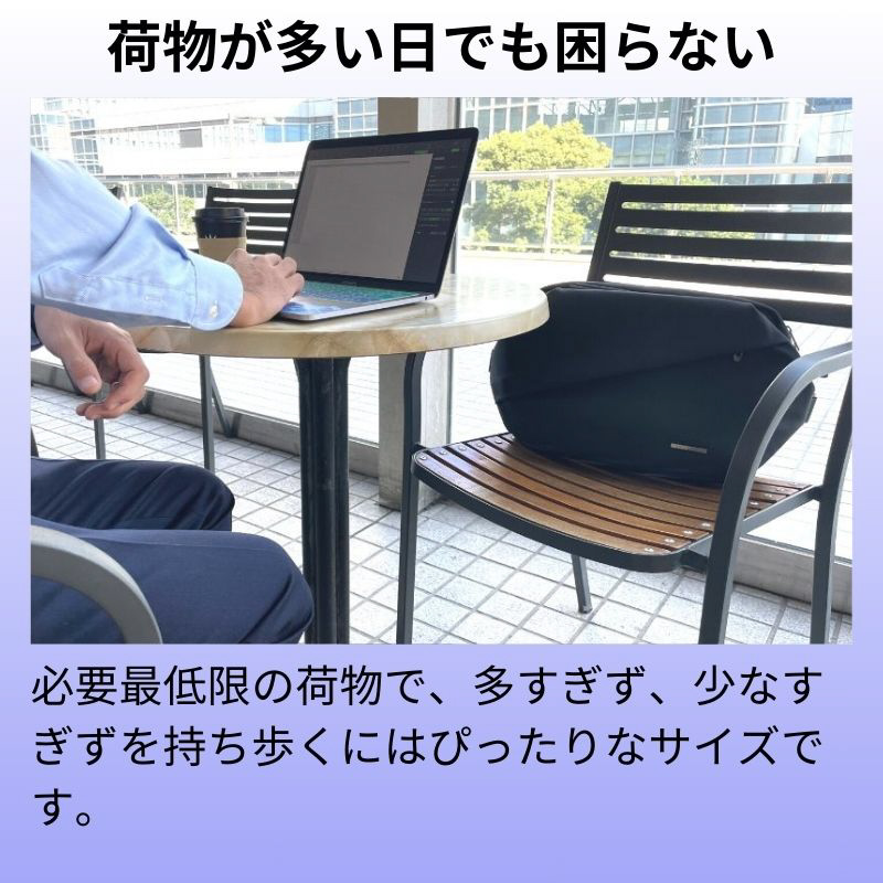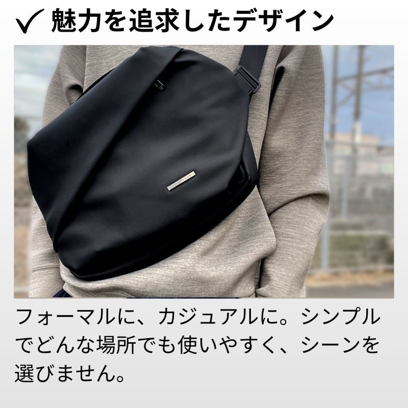 必要なものを、必要なだけ持ち歩きたいから、大きすぎずちょうどいいビジネスマンのためのボディバッグです。