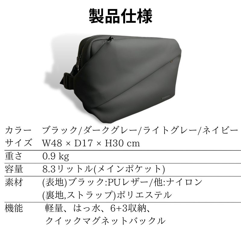 ポケットが少なくごちゃごちゃしにくいボディバッグの欠点をなくし、6つのポケットと3つの収納スペースで細かく整頓して、探す手間をなくします。