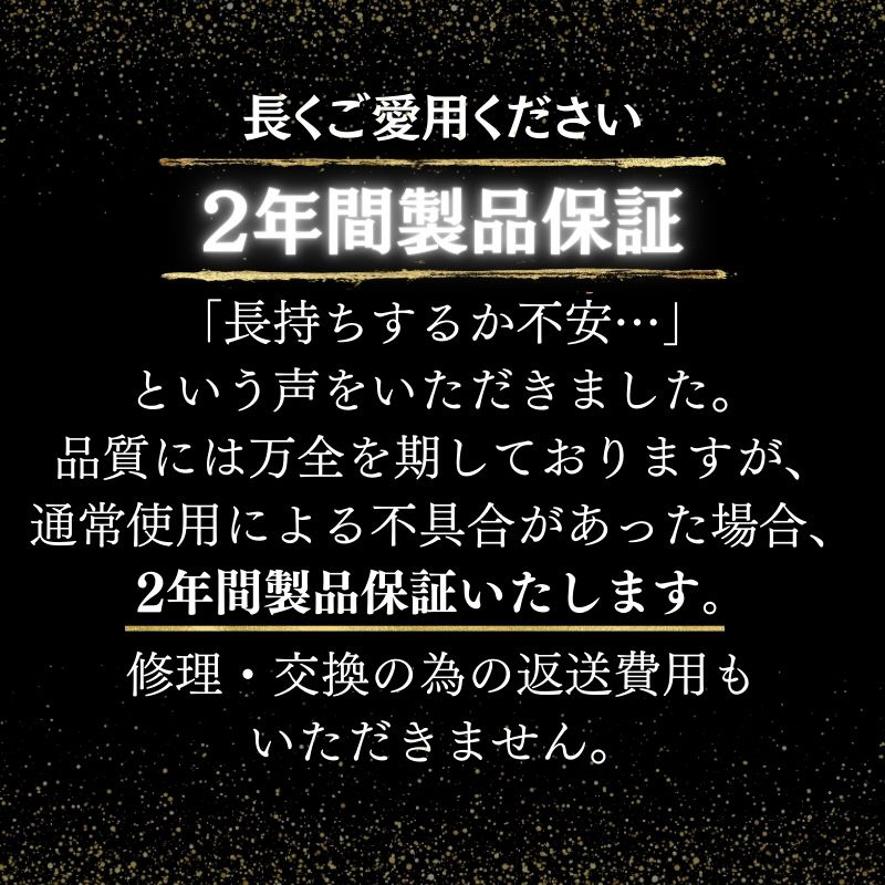 長くご愛用いただくために、通常使用での破損、不具合があったらすぐに修理・交換いたします。返送費用もいただきません。