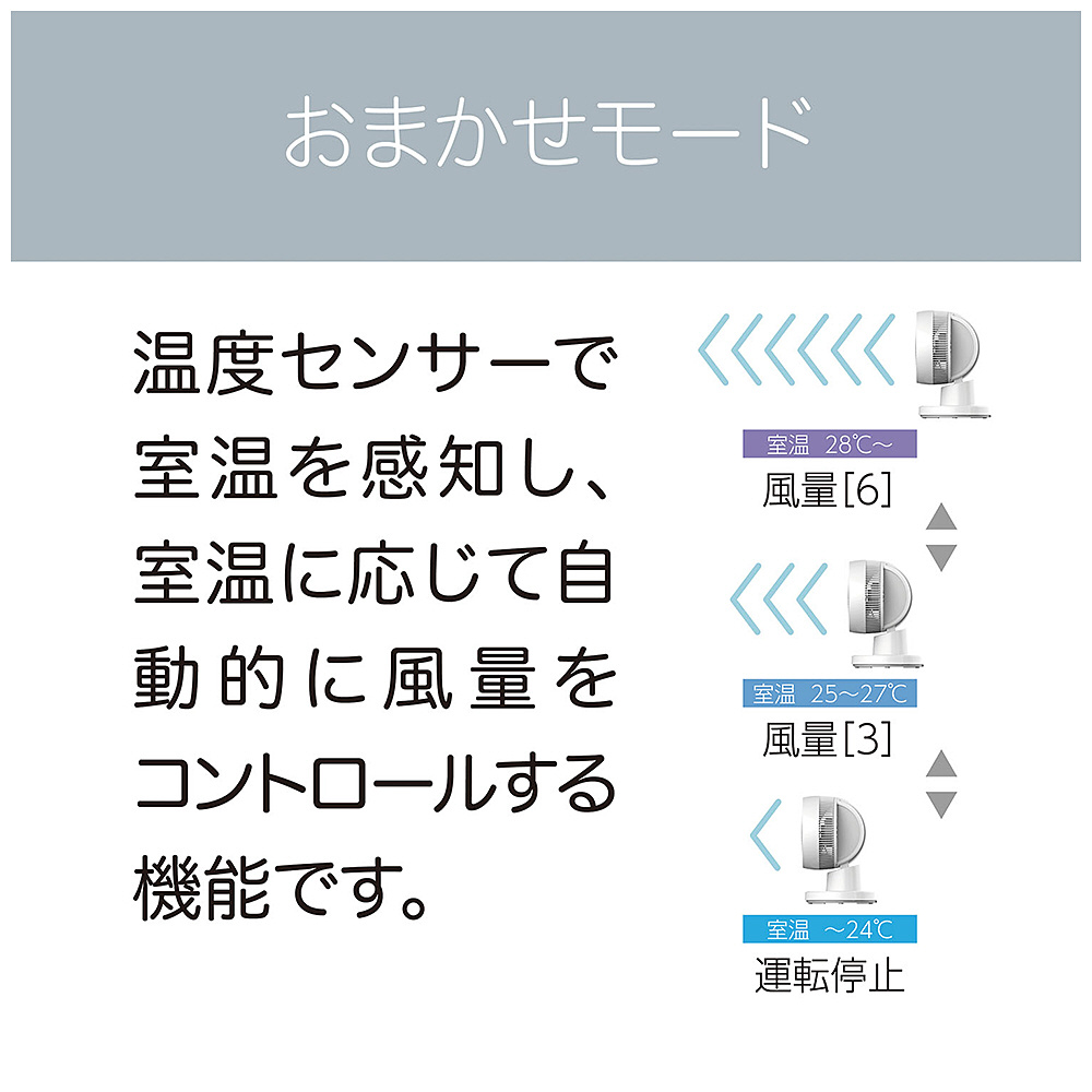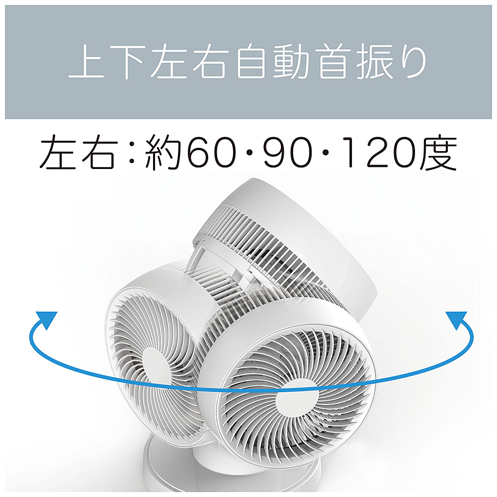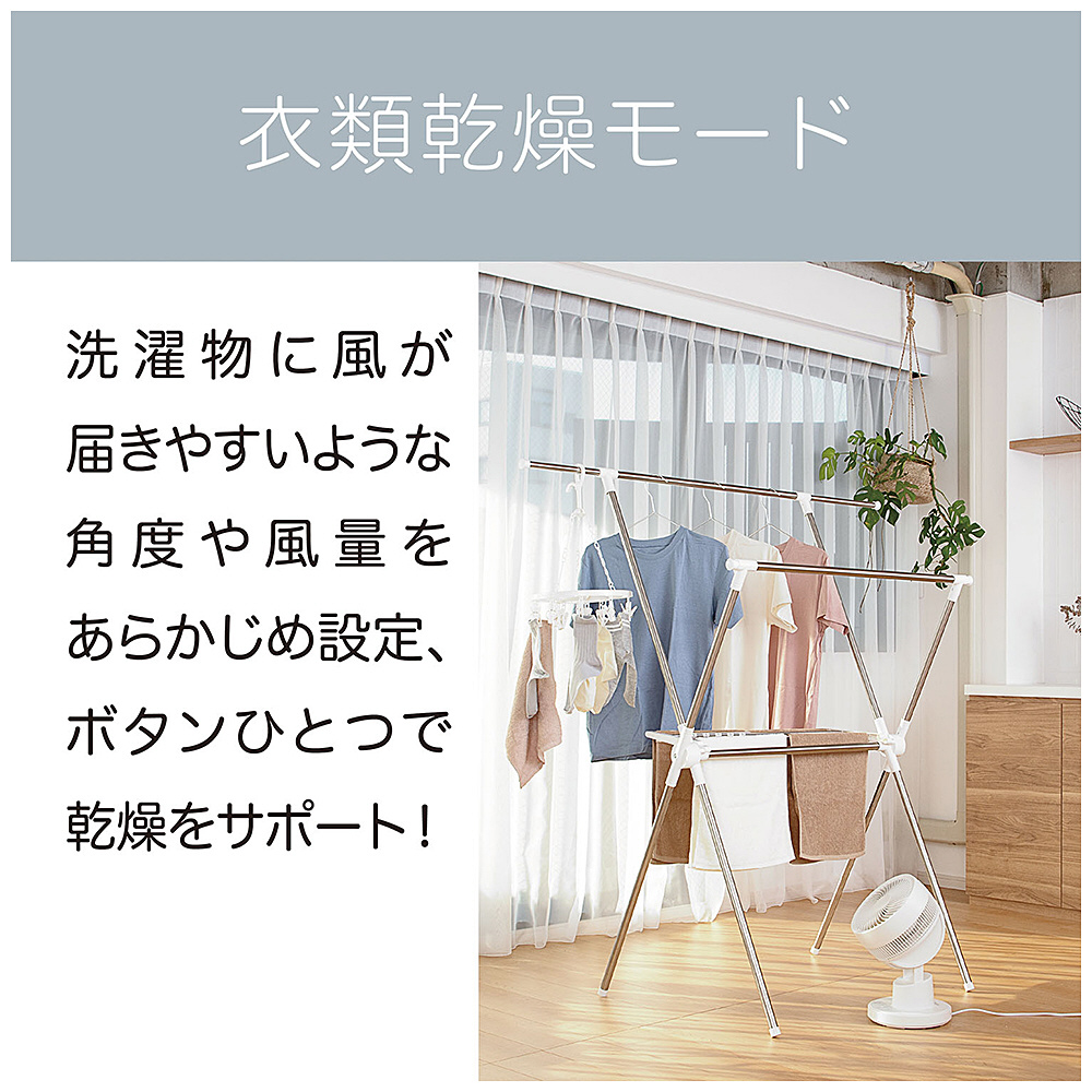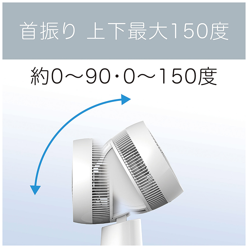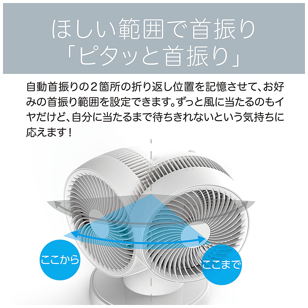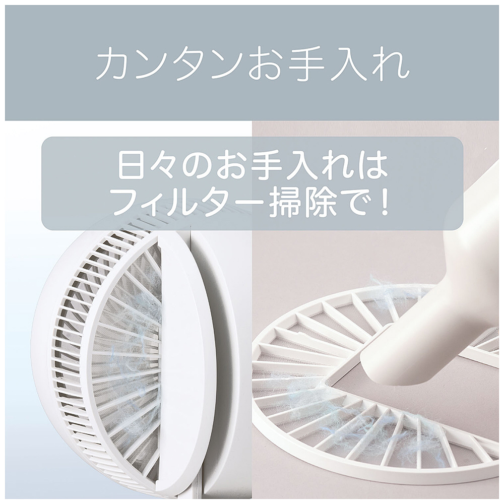 自動首振りの範囲を任意に設定可能な「ピタッと首振り」機能搭載。上下首振り最大角度150度だから空気循環を効率よく。ほこりをキャッチする取り外し可能なフィルター搭載だからお手入れも簡単。