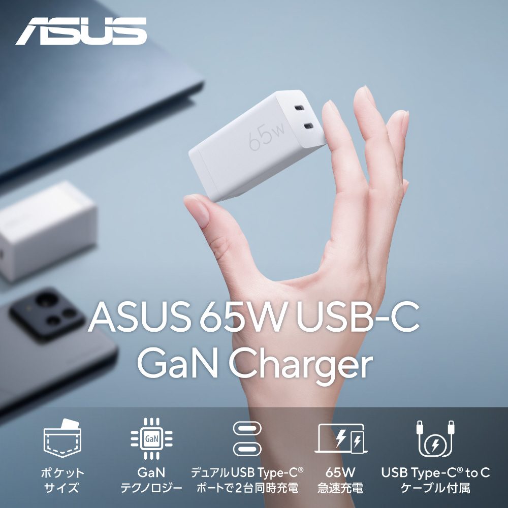 ASUS 65W USB-C GaN Chargerはノートパソコンやスマートフォンなどのモバイルデバイスのためのポケットサイズのアダプターです。