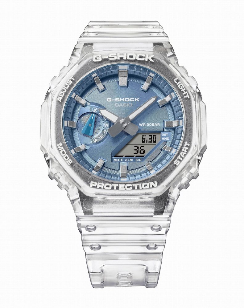 文字板に人気のカラーリングであるスカイブルー、ローズゴールド、シルバーのメタル蒸着塗装を施し、ベゼルとバンドはスケルトン素材にすることで、サマーシーズンに向け涼しげな印象に仕上げました。