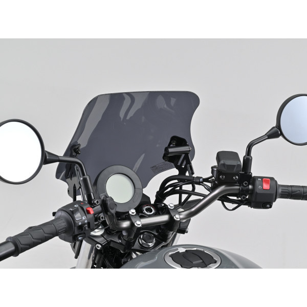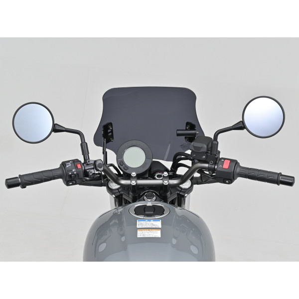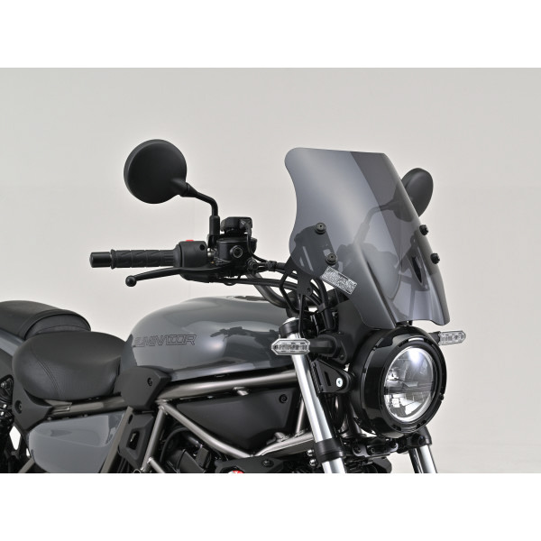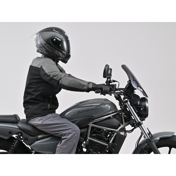 走行風の影響を受けやすいアップライトなポジションのエリミネーターで高速道路を走行する時の風圧からライダーを守る専用ウインドシールド。