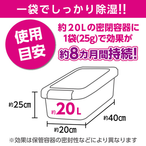 ○内容: 1袋25g×4コ○用途: 防湿・防カビ(脱臭剤入)○使用量の目安: 約20L容器に1コ○有効期限: 4〜12ヶ月(平均8ヶ月)○成分: 生石灰、活性炭