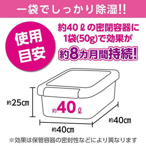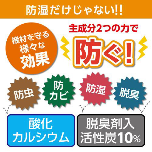 防湿効果も持続力もカビストッパーの2倍。アルミケースや大きめの収納ボックスに最適です。サビや虫食いにも効果があり、洋服ダンスなどにも。脱臭効果が強く食品には不向きです。