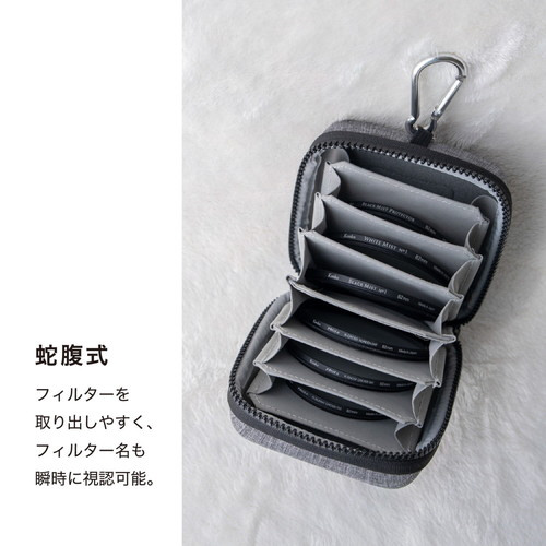 82mm径までのフィルターを6枚収納可能な蛇腹式フィルターケース。