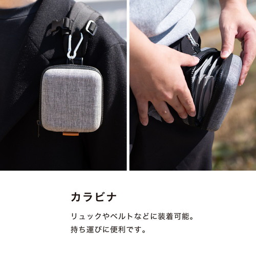 カラビナ付きでリュックやベルトなどに装着可能。持ち運びに便利です。