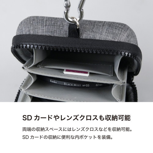 両端の収納スペースにはレンズクロスなどを収納可能。SDカードの収納に便利な内ポケットを装備。