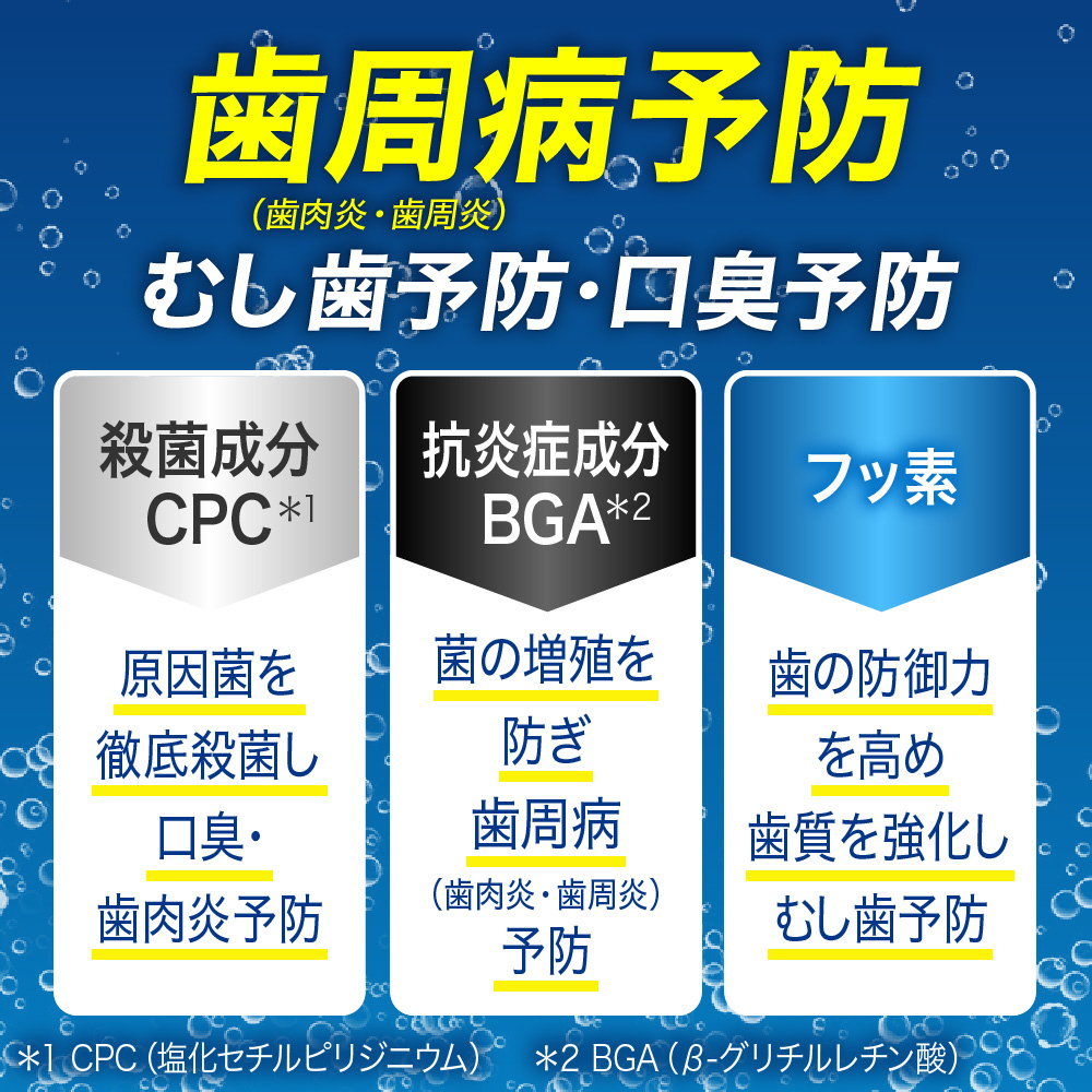 薬用成分 PEG-8 モノフルオロリン酸ナトリウム(フッ素) 塩化セチルピリジニウム(CPC) β-グリチルレチン酸(BGA)